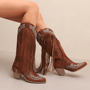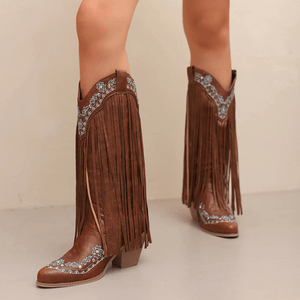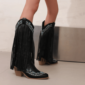 Låt dina steg tala med dessa spektakulära cowboyboots med tofsar och broderad vintageinspirerad design. Med sina eleganta detaljer, sina svajande fransar och sin autentiska känsla för western, är de mer än bara skor – de är ett statement. Oavsett om du ska på festival, dansar barfota i vardagsrummet eller bara vill lyfta en enkel outfit, är de här bootsen din nya favorit.