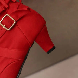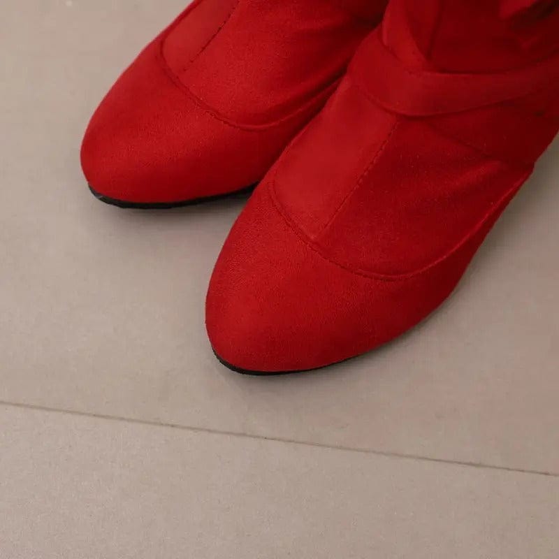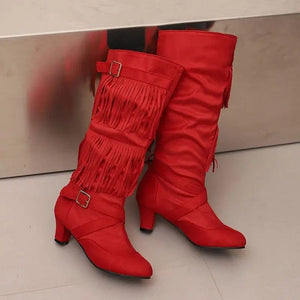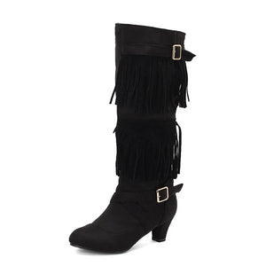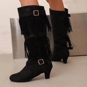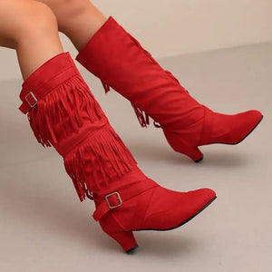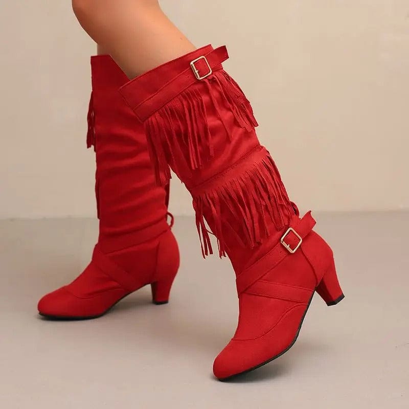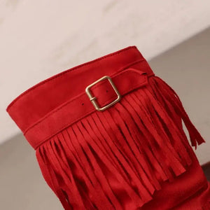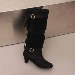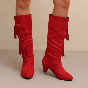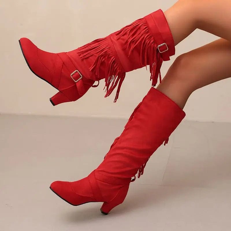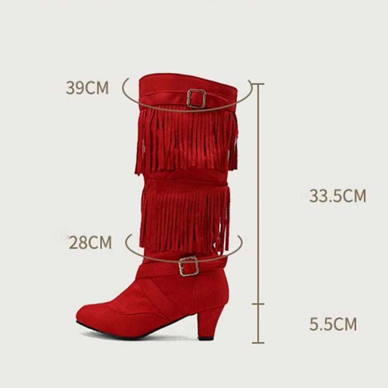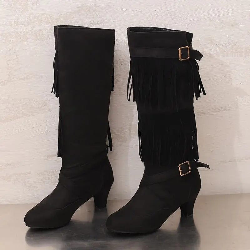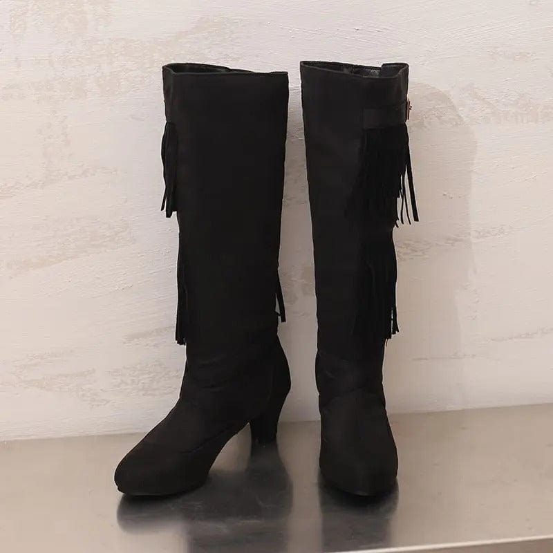 Låt din inre cowgirl ta plats med dessa knähöga cowboyboots i mjuk mockalook. De lekfulla tofsarna och de glansiga spänndetaljerna skapar en perfekt balans mellan bohemisk charm och självsäker stil. Oavsett om du bär dem till jeans, klänning eller kjol, lyfter de varje outfit med en touch av western–attityd och feminin styrka.