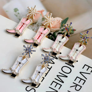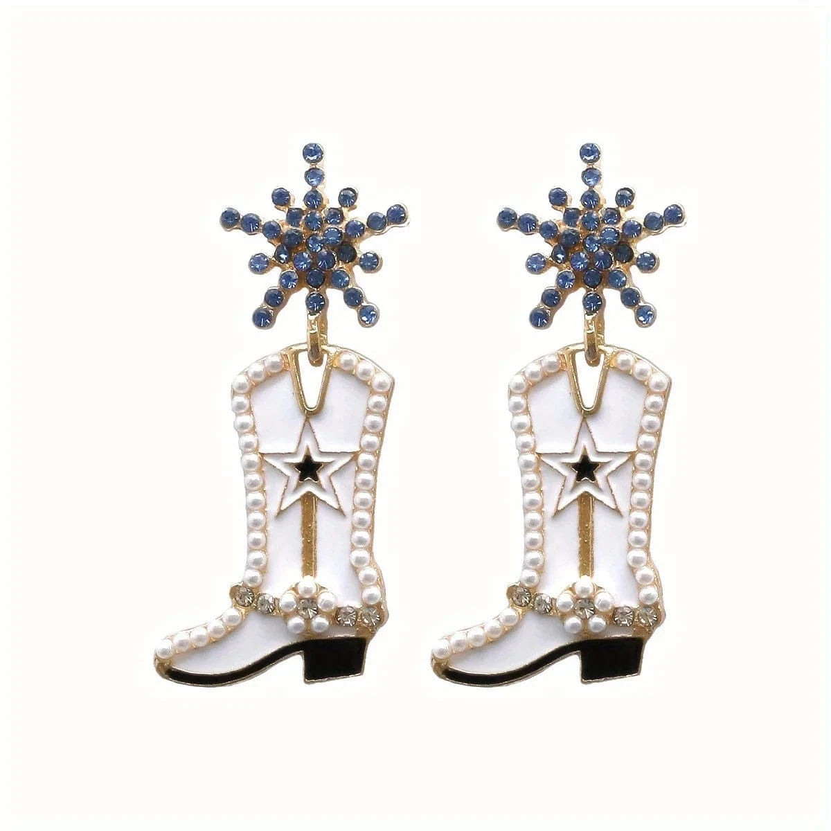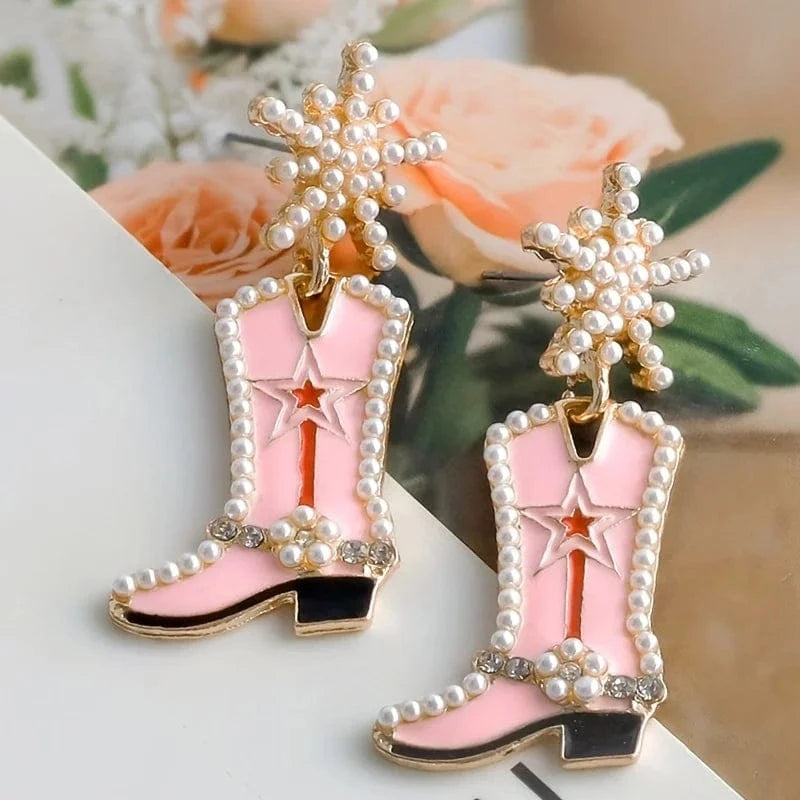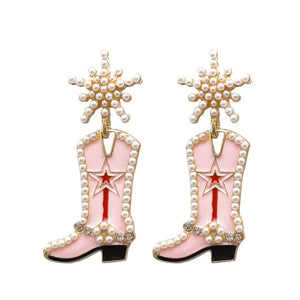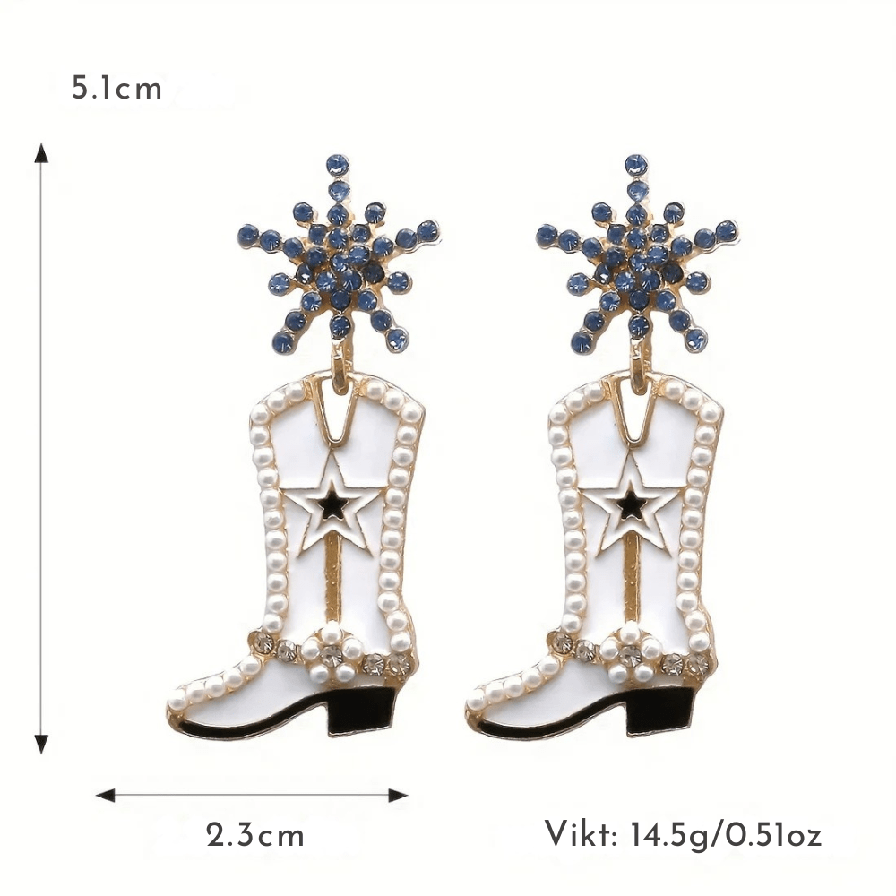 Cowboyboots-örhängen med pärlor och snöflinga – lekfull westerncharm i ett elegant uttryck