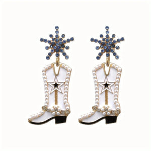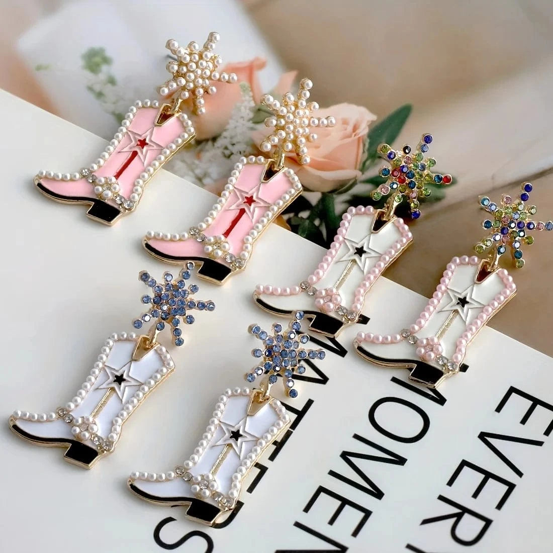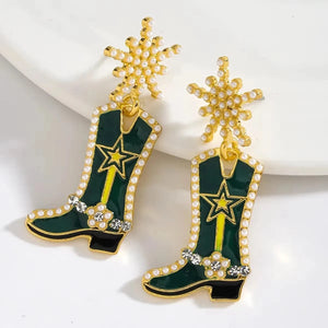 Låt din stil glittra med ett par örhängen som kombinerar cowboystilens själ med festlig glamour. Dessa bootsformade örhängen, dekorerade med pärlor och en färgstark snöflinga, är perfekta när du vill sticka ut med en unik accessoar.