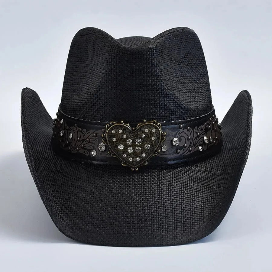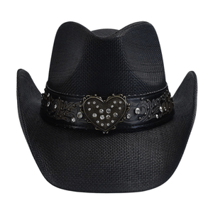 Cowboyhatt i svart flätad halmlook med hjärtspänne