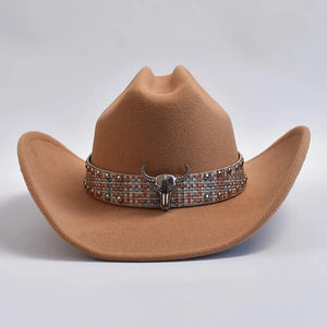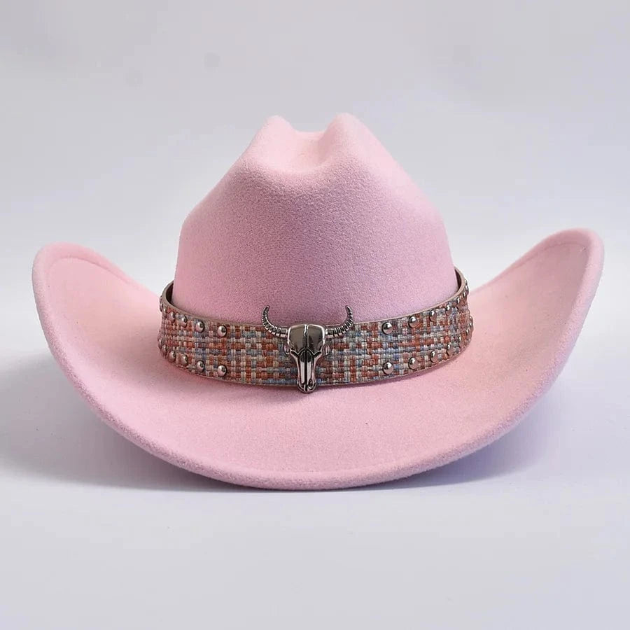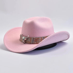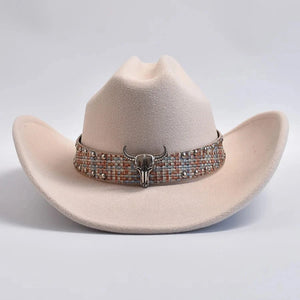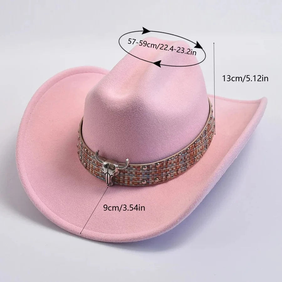 Låt din inre cowgirl ta plats med denna tidlösa cowboyhatt i västernstil. Den mjuka filtkänslan, den breda brättet och det dekorativa bältet med metallspänne i form av ett tjurhuvud skapar en sofistikerad look som passar både fest och vardag. Perfekt för dig som vill kombinera feminin elegans med en djärv, fri känsla.
