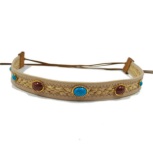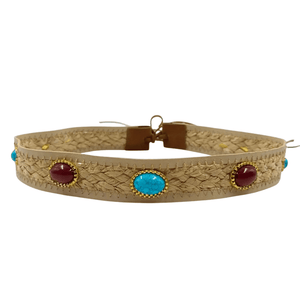 Låt ditt favorithatt få nytt liv med detta stilfulla cowboyhattband, prytt med ovala dekorstenar som ger en subtil men slående westernkänsla. Den mjuka fusklädret, kombinerat med detaljer i turkos och jordiga toner, skapar ett band som känns både tidlöst och lyxigt. Perfekt för dig som vill ge din look mer karaktär – oavsett årstid.