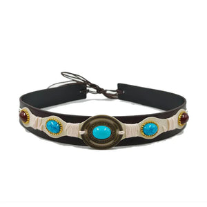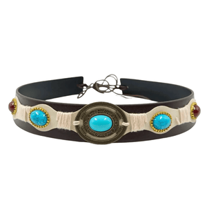Låt ditt cowboyhatt-utseende få nytt liv med detta exklusiva hattband dekorerat med stora, gnistrande turkosstenar. Ett perfekt sätt att ge din favoritfedora mer karaktär, färg och en genuin westernkänsla. Detaljerna i metall, de turkosa kaboscherna och de jordnära tonerna skapar en lyxig men ändå rå look som passar alla dina äventyr.