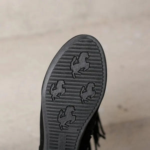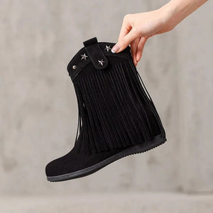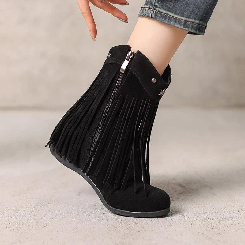 Dags att höja din western-look till nya höjder! Våra cowgirl-ankelboots i mjuk mocka är precis vad du behöver för att sätta en självsäker, feminin och trendriktig prägel på dina outfits. Med sina flörtiga fransar, eleganta stjärndetaljer och höjdförhöjande sula får du både komfort och karaktär – oavsett om du rider genom stan eller dansar natten lång.