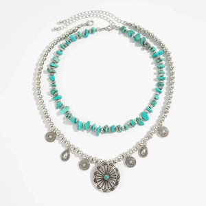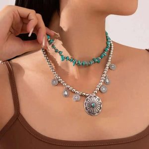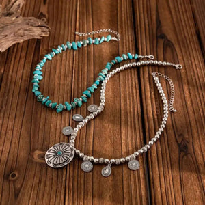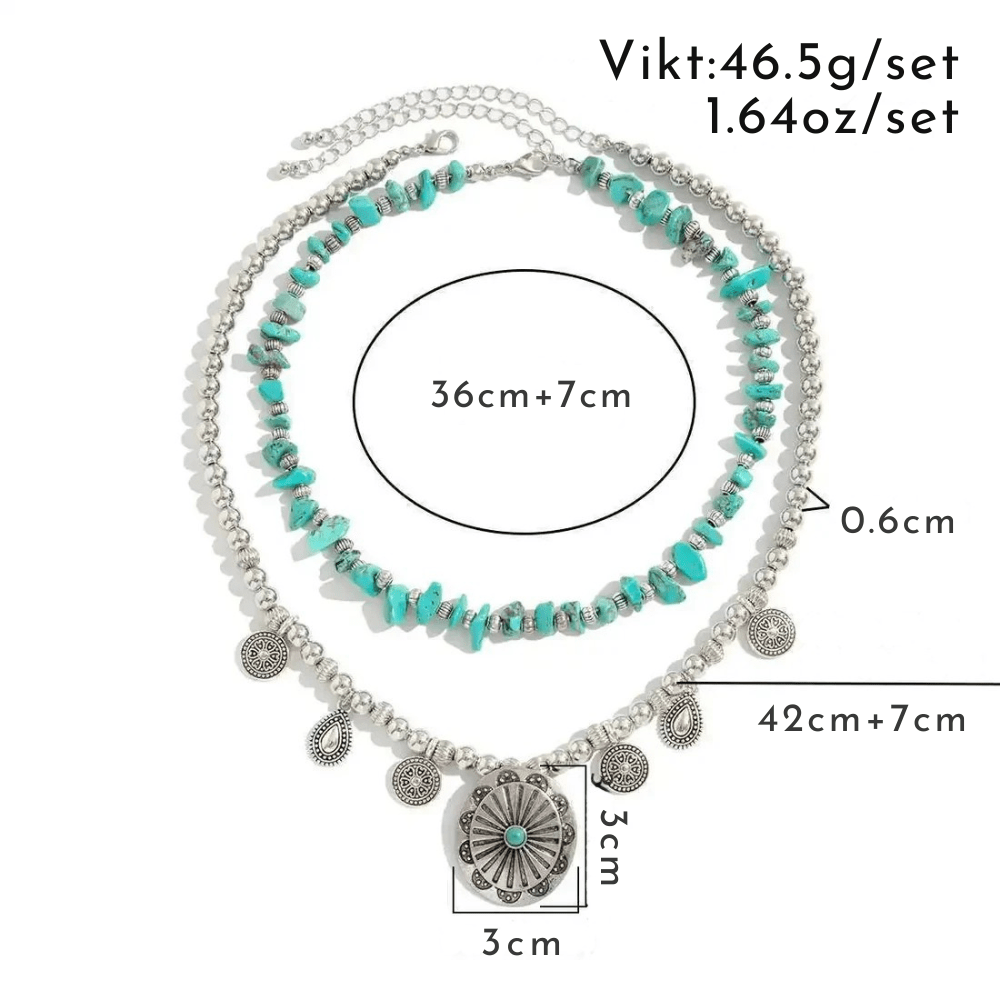 Låt din stil tala med kraftfulla symboler från västern. Detta dubbla halsband kombinerar turkosens magi med silverfärgade berlocker som fångar både ljus och blickar – perfekt för dig som vill utstråla självsäkerhet och frihet.