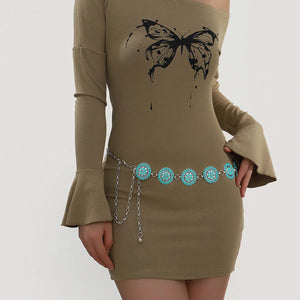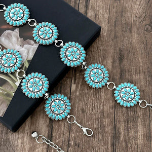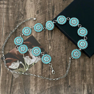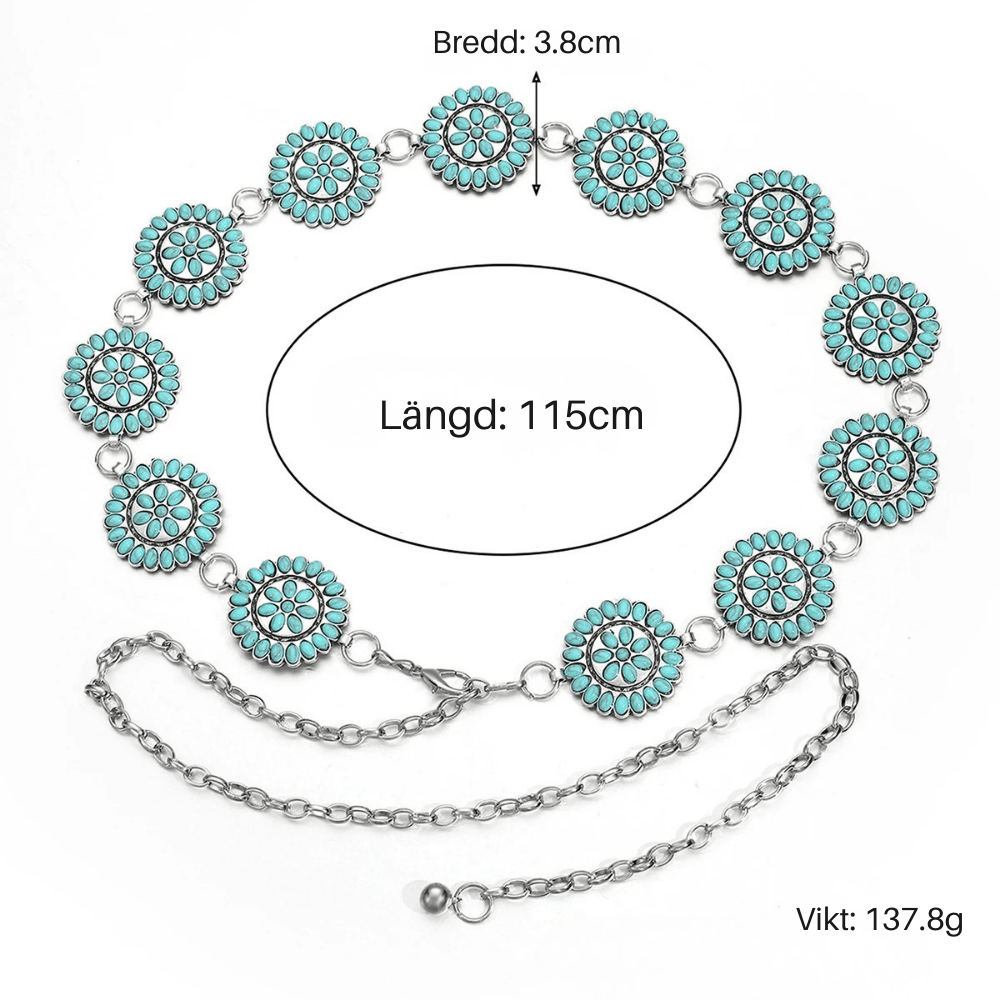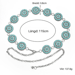 Föreställ dig känslan av att ta ett kliv in i en klassisk westernfilm – varje steg ackompanjerat av en lätt klingande kedja och solreflexer från turkosa conchos. Vårt kedjebälte med runda turkosconchos är det lilla extra som förvandlar varje outfit till ett statement. Perfekt att bära över en enkel klänning eller ett par slitna jeans – oavsett stil lyfter det din look med självsäker elegans.