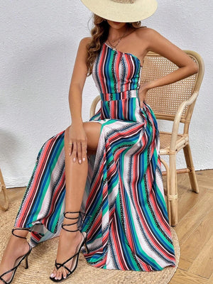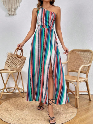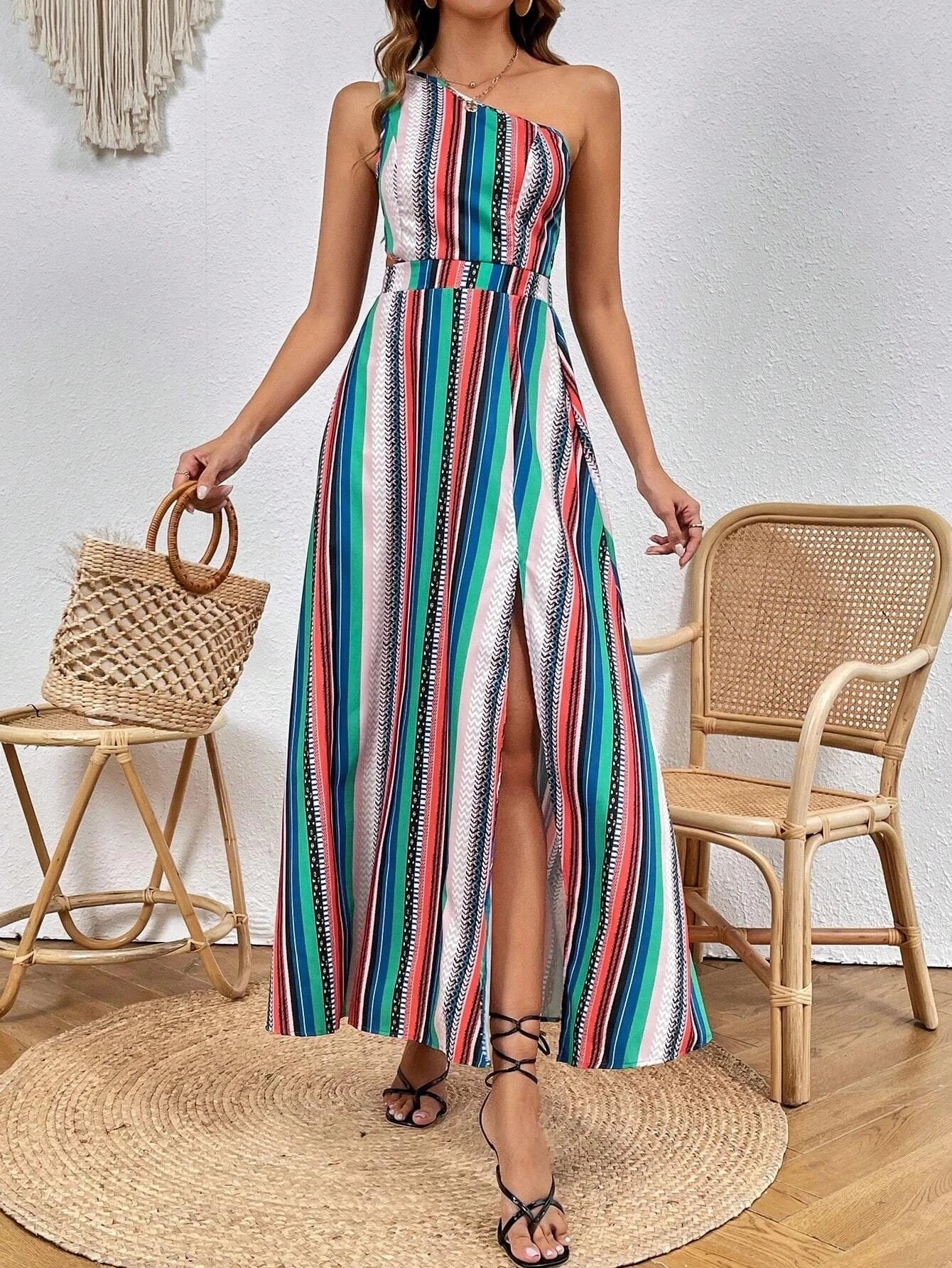 Färgglad randig one shoulder-klänning med hög slits – för heta sommardagar