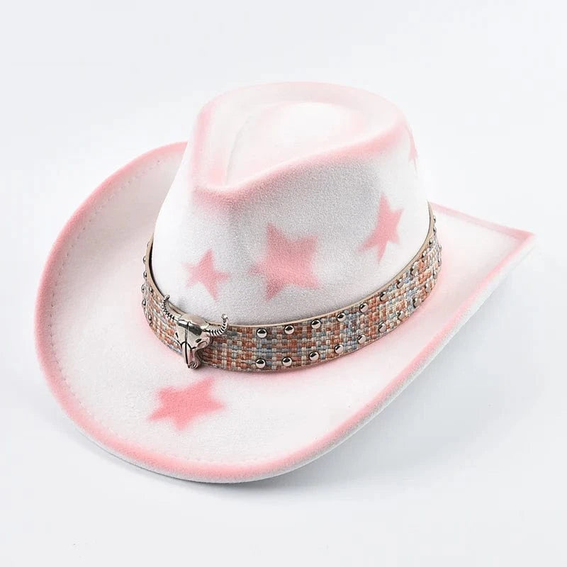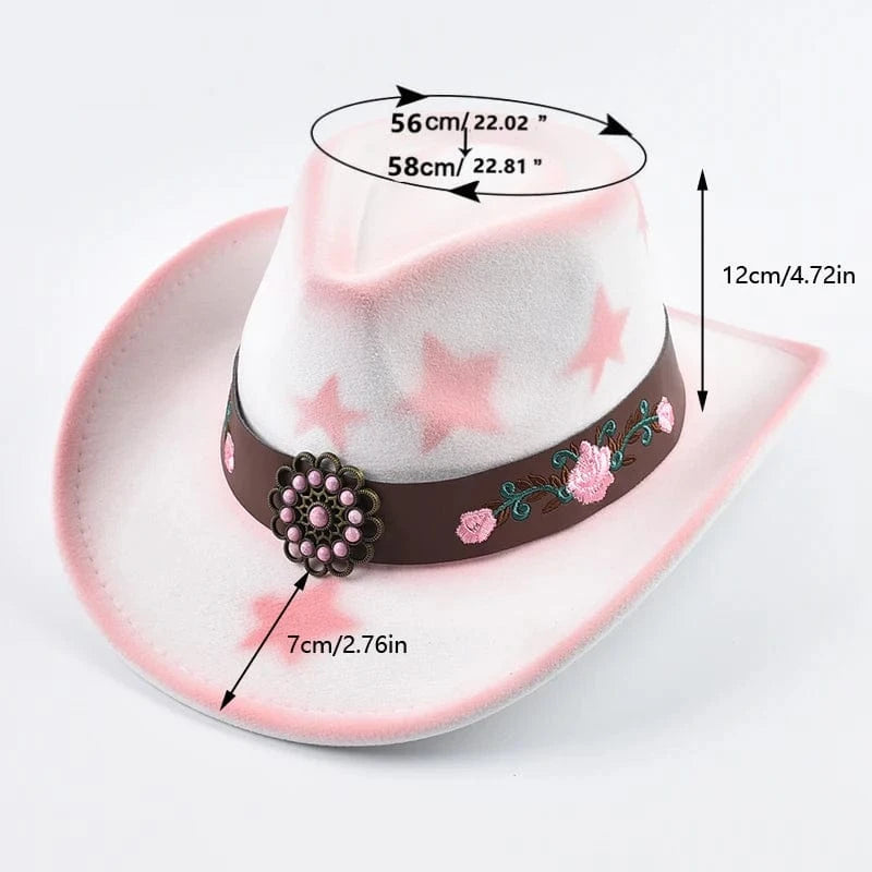 Gör entré med stil i vår Filt Cowboyhatt Dam, en perfekt blandning av klassisk western och feminin elegans. Den mjuka filten i vitt med rosa stjärnor och dekorativa bälten fångar blicken direkt – oavsett om du bär den på festival, temafest eller en dag ute på landet. Lika bekväm som den är trendig, ger den varje outfit en lekfull men självsäker touch.