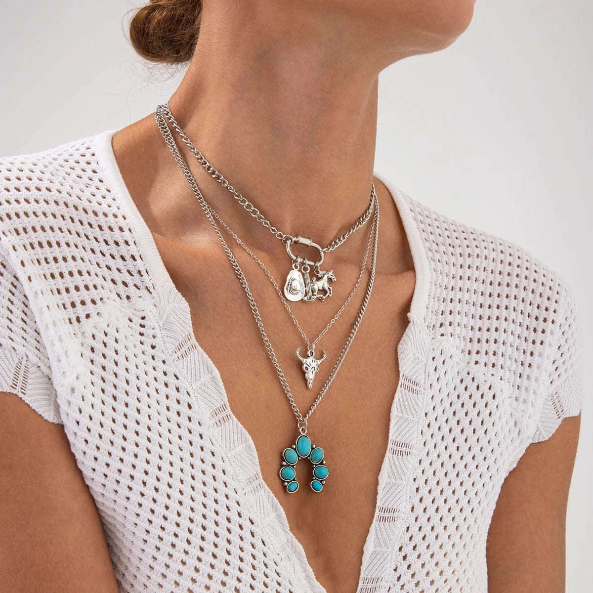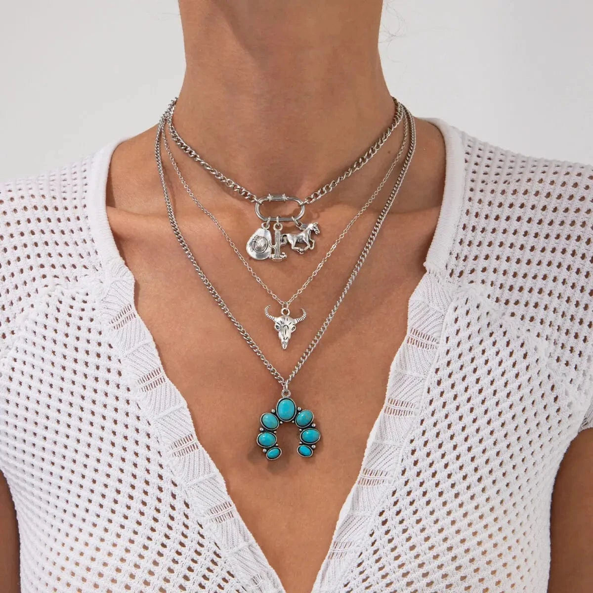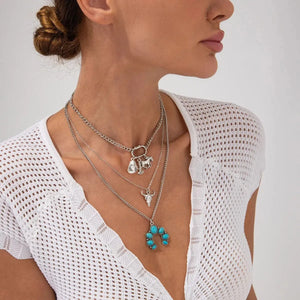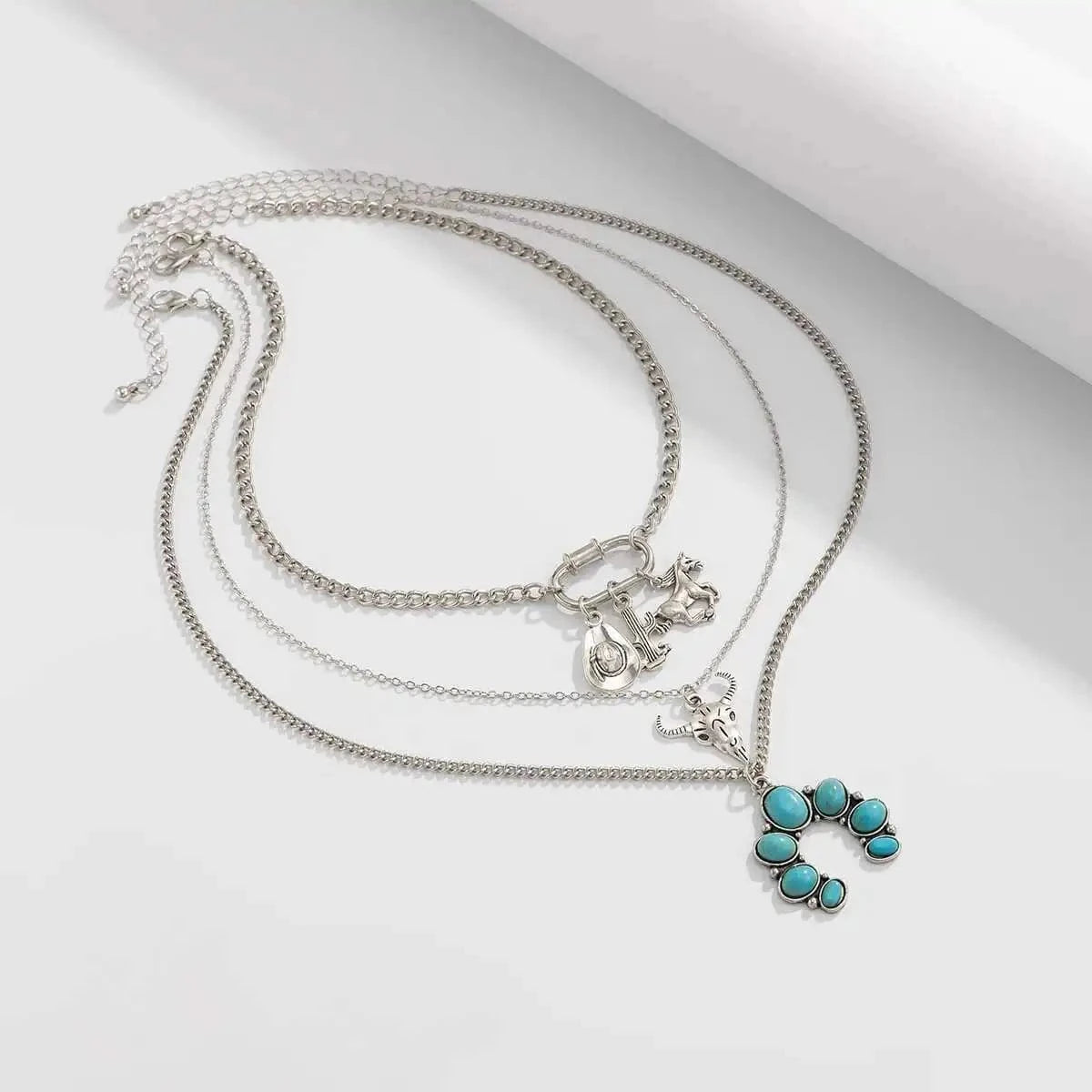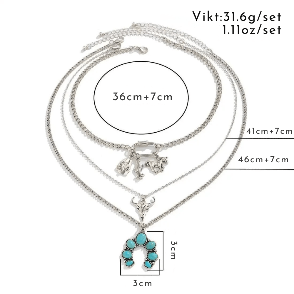 Låt västern möta bohemisk charm. Detta halsbandsset i flera lager är prytt med turkosa stenar och detaljerade cowboy-inspirerade berlocker som ger din outfit en rå men sofistikerad känsla.
