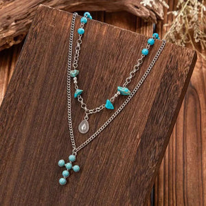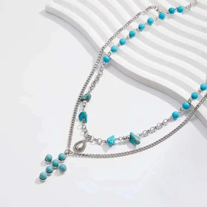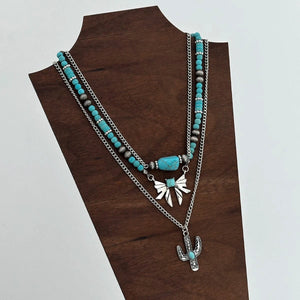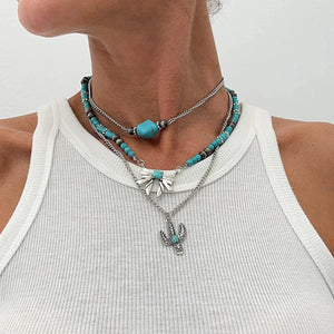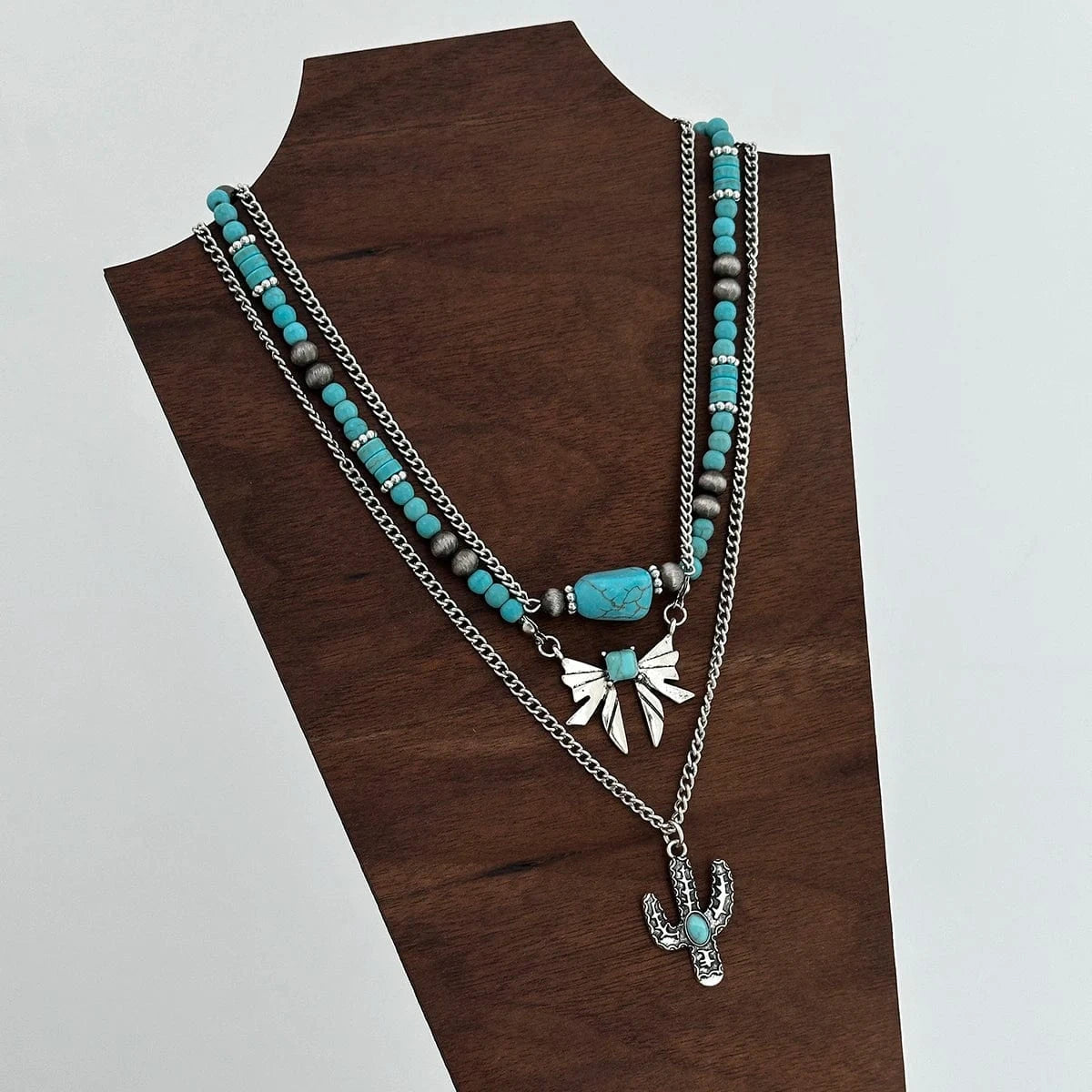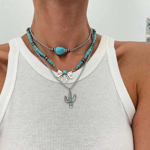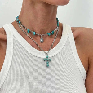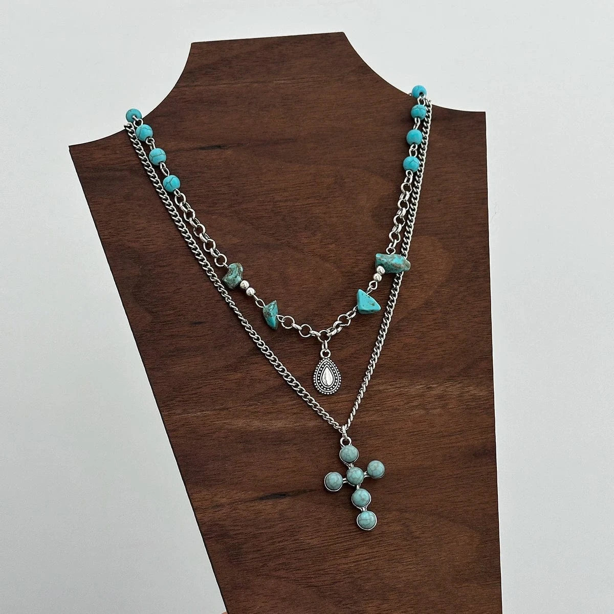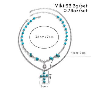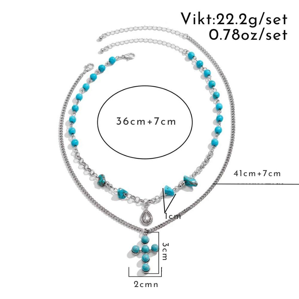 Detta lager-på-lager halsbandsset kombinerar rå westernkänsla med bohemisk elegans. Turkosa stenar, korshänge och chokerdesign skapar en look som känns både självsäker och tidlös.