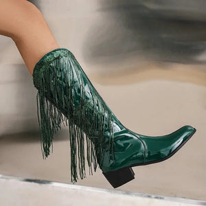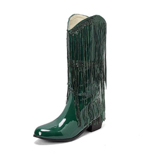 Dina drömboots har precis anlänt – och de är allt annat än diskreta. Med sitt glansiga lack, dramatiska fransar och oemotståndlig cowgirl-attityd är våra Glamorösa Cowgirl Boots med Fransar skapade för dig som vågar ta plats. Kliv in i ett par som förvandlar varje steg till en show.