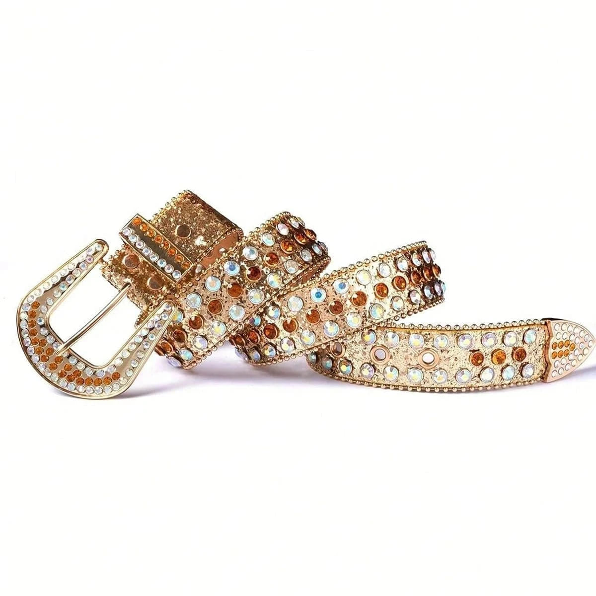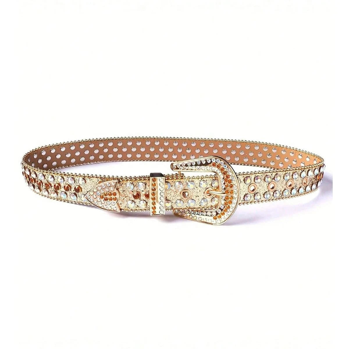 När du vill blända – och behålla din edge – är det här bältet din bästa vän. Prickigt med regnbågsskimrande och cognacfärgade rhinestones, i en varm guldton som lyser upp varje outfit, från cowgirlklänningar till slitna jeans.