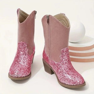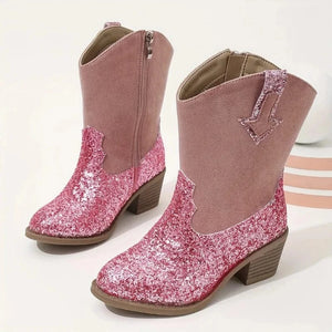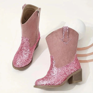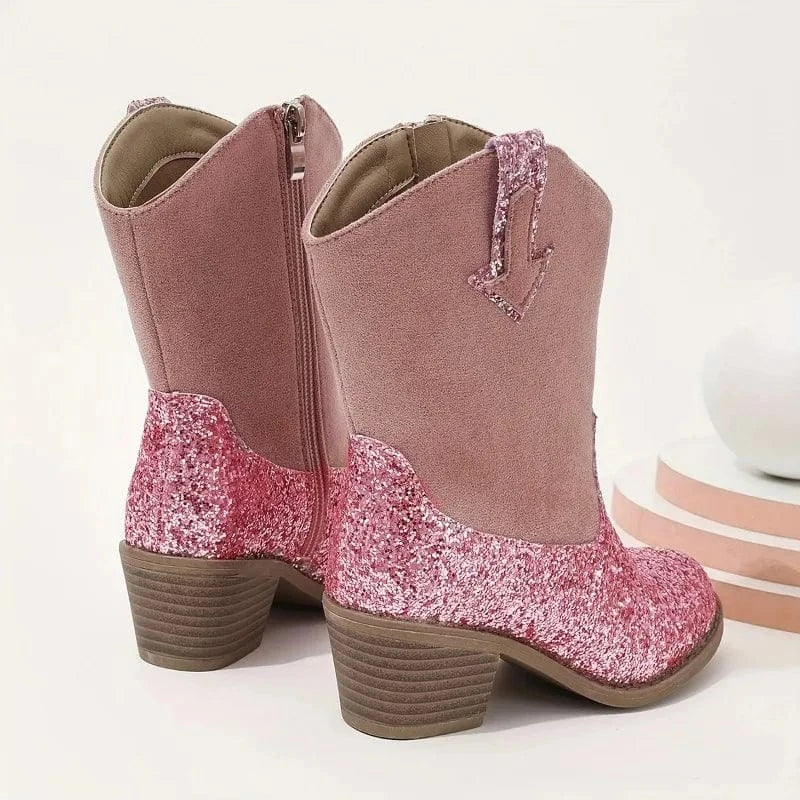 Låt din lilla cowgirl glänsa som aldrig förr med våra glittriga rosa cowboystövlar. De är inte bara ett par skor – de är en känsla. Perfekta för vardagens äventyr, dans i köket eller fantasifulla resor till vilda västern. Med en kombination av gnistrande glitter, mjuk insida och bekväm passform är de här stövlarna designade för att göra varje steg magiskt.