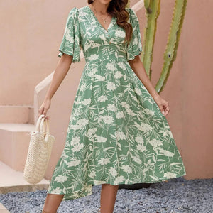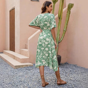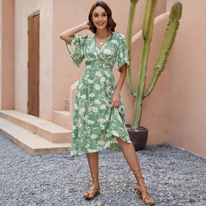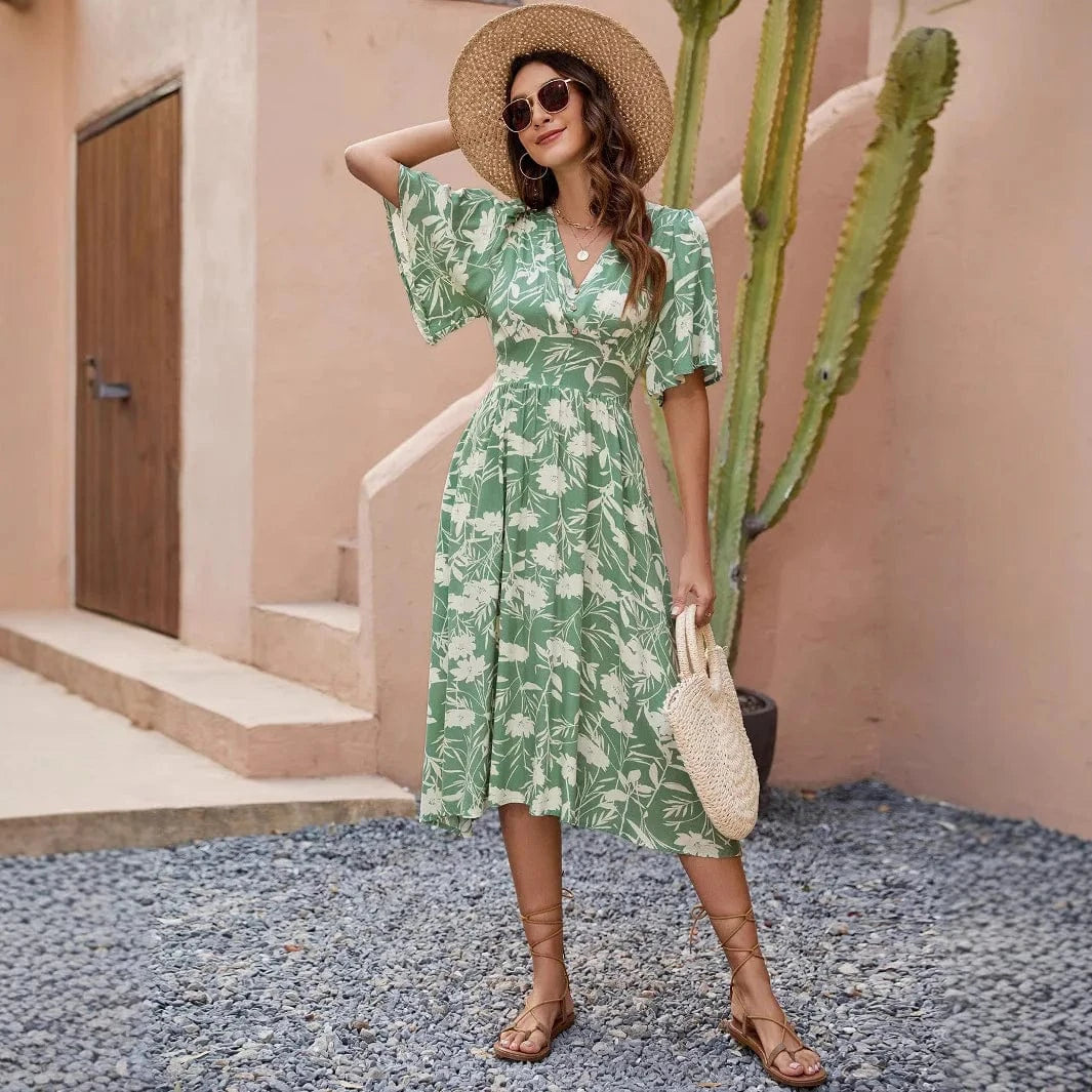 Låt sommaren blomstra i din garderob med denna gröna blommiga klänning. Med sin feminina silhuett och luftiga känsla är den perfekt för både lata dagar och festliga kvällar.