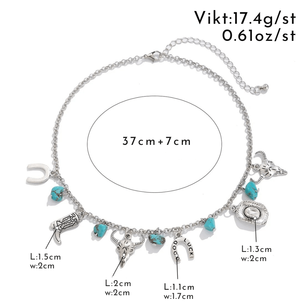 Detta halsband fångar den råa och fria känslan av westernlivet med sina detaljerade berlocker och inslag av turkos. Perfekt för dig som vill bära med dig både symbolik och stil i ett och samma smycke.