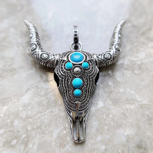 Halsbandshänge med tjurkranium i silver och turkos – en symbol för styrka och frihet