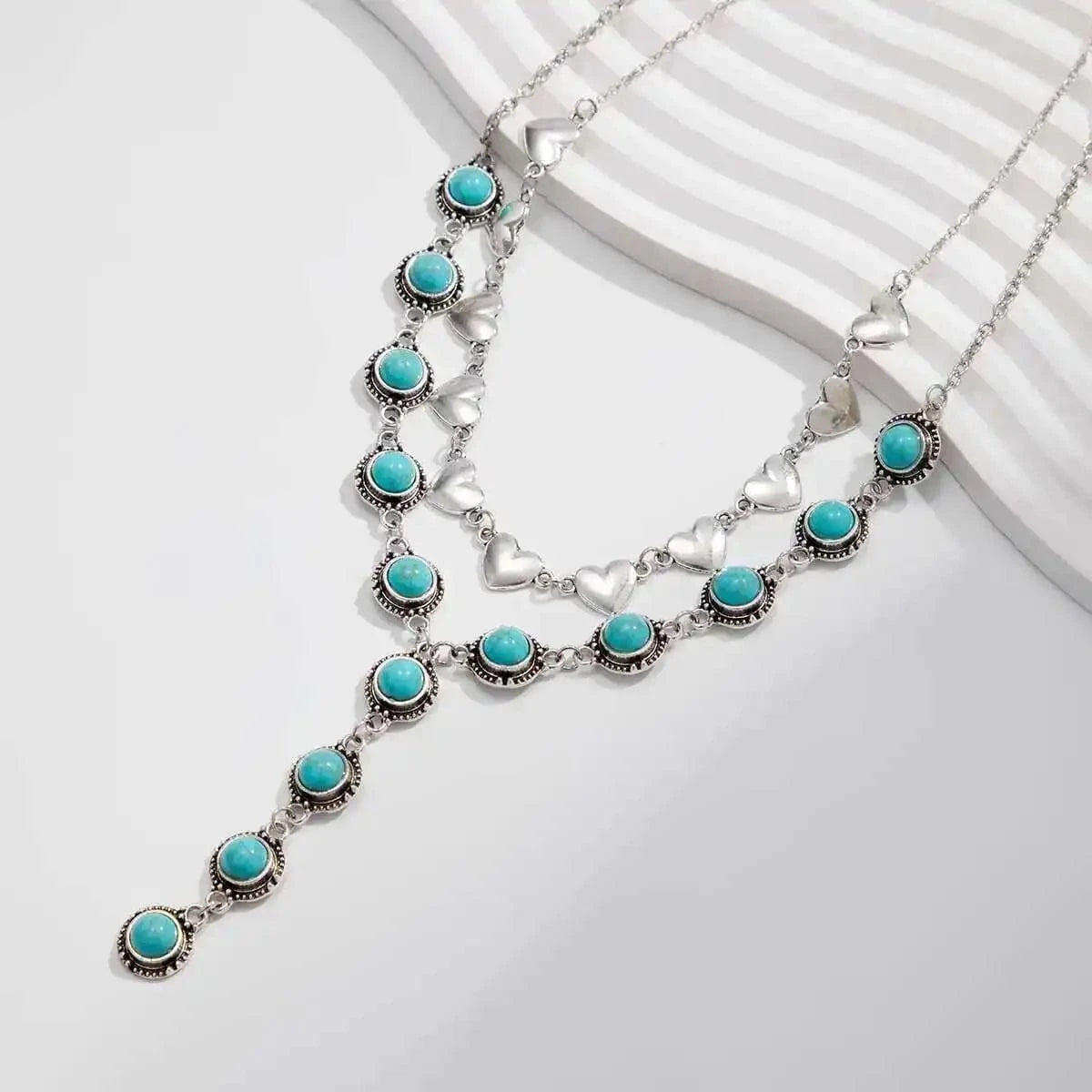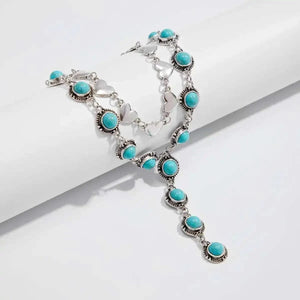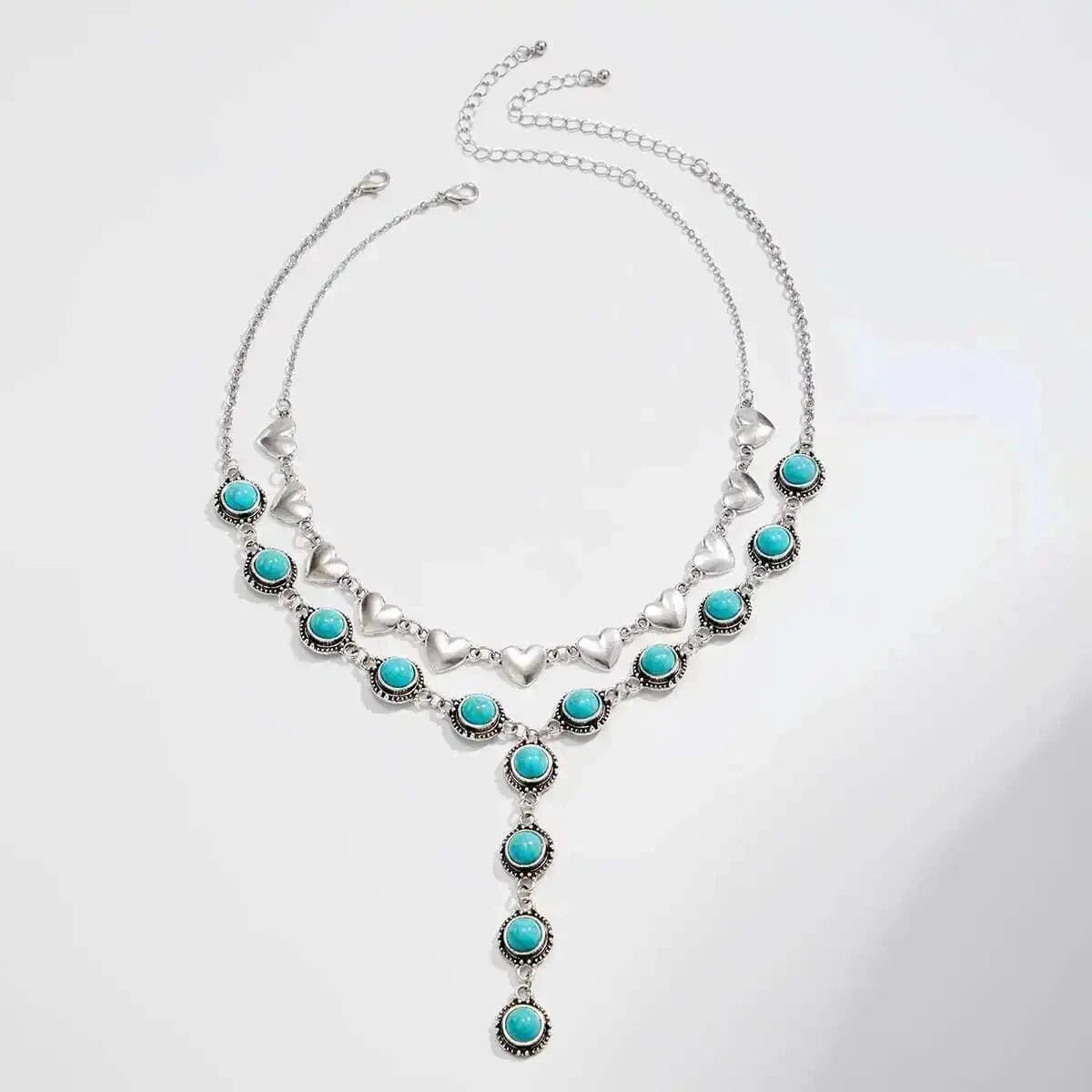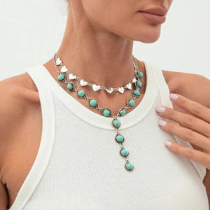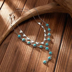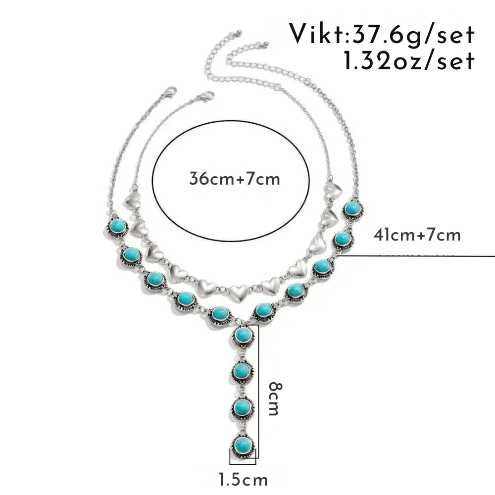 Låt din look tala med självsäkerhet och charm. Det här halsbandssetet kombinerar den vilda västerns råa energi med mjuka, romantiska detaljer som turkosa stenar och hjärtformade länkar.