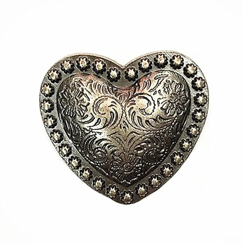 Kärlek sitter i detaljerna – och denna hjärtformade concho är beviset. Med ett graverat blommönster och antik känsla i silver, koppar, mässing eller blank yta är den skapad för att förädla väskor, sadlar, skärp och DIY-projekt med själ.