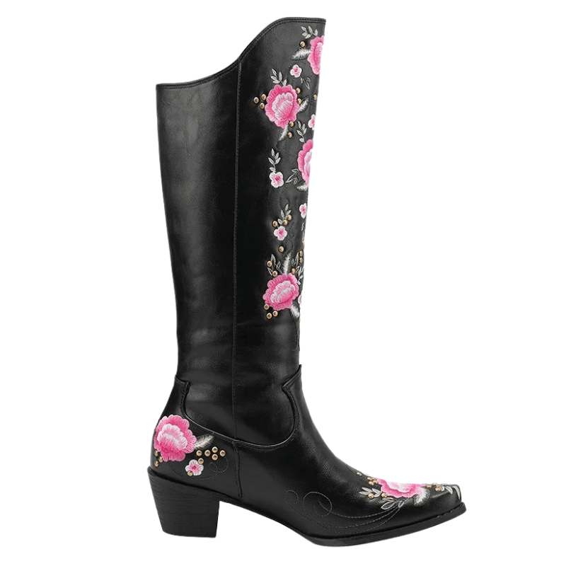 Låt din look blomma ut med dessa eleganta cowgirlboots där romantiska rosbroderier möter vilda fransdetaljer. Perfekta för dig som älskar en feminin touch men vill behålla den där kaxiga westernattityden. Oavsett om du är på fest, klubb eller bara vill göra vardagen lite mer spektakulär – de här stövlarna kommer att väcka uppmärksamhet vid varje steg.