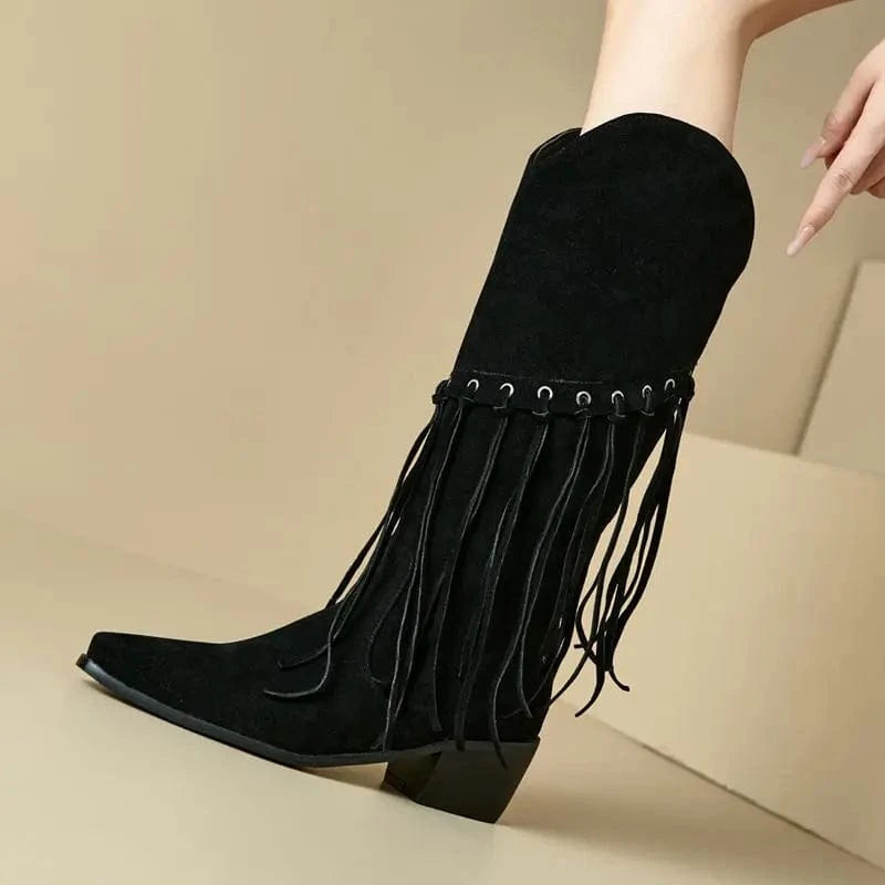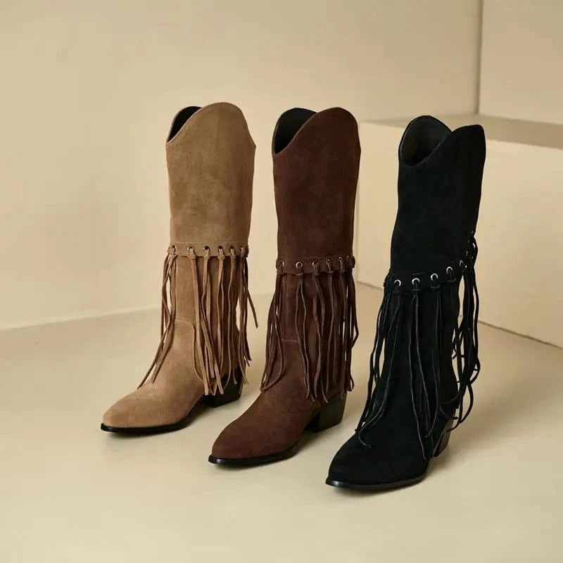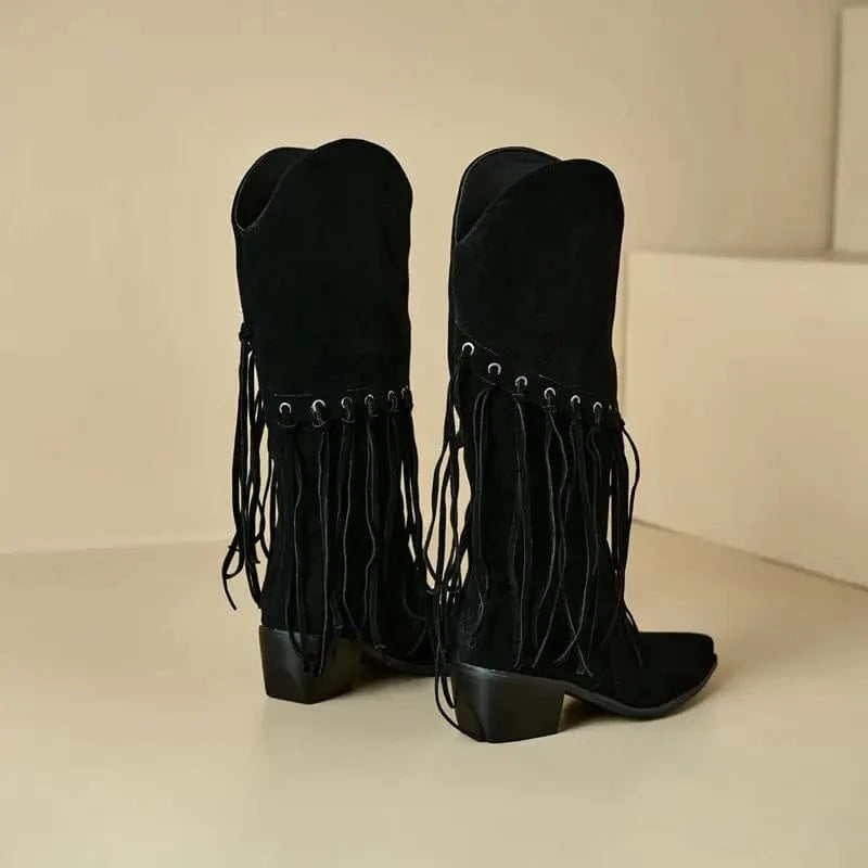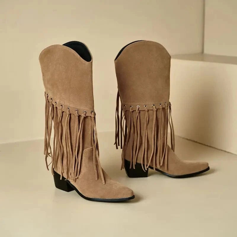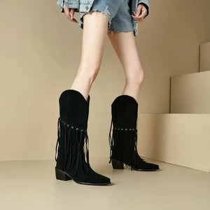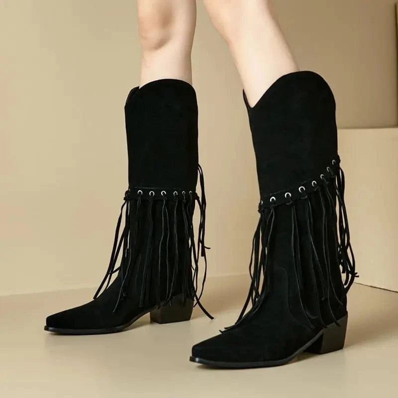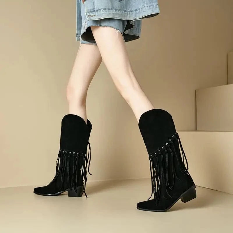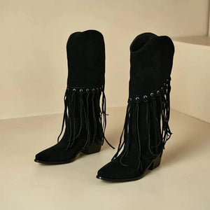 Drömmer du om att fånga den där autentiska westernkänslan – med en modern och elegant twist? Våra höga cowboyboots med fransar i mjuk mockalook är skapade för dig som älskar frihet, rörelse och stil. Oavsett om du kliver ut på festivalfältet eller dansar under stjärnorna, blir de här stövlarna din trogna följeslagare.