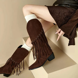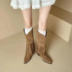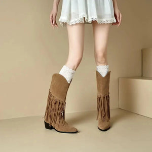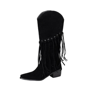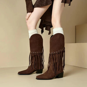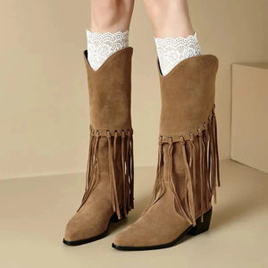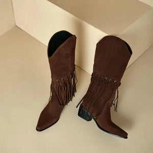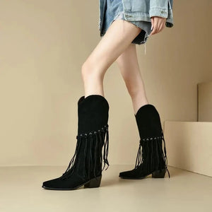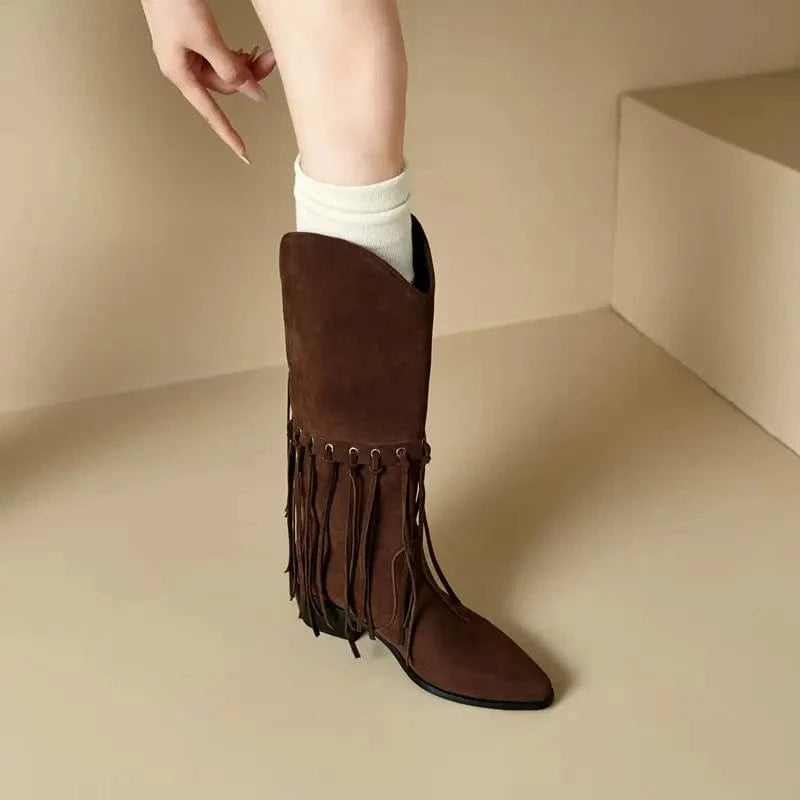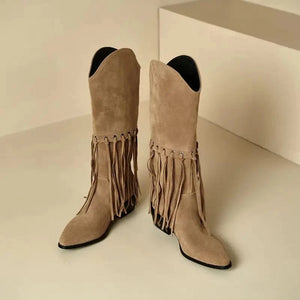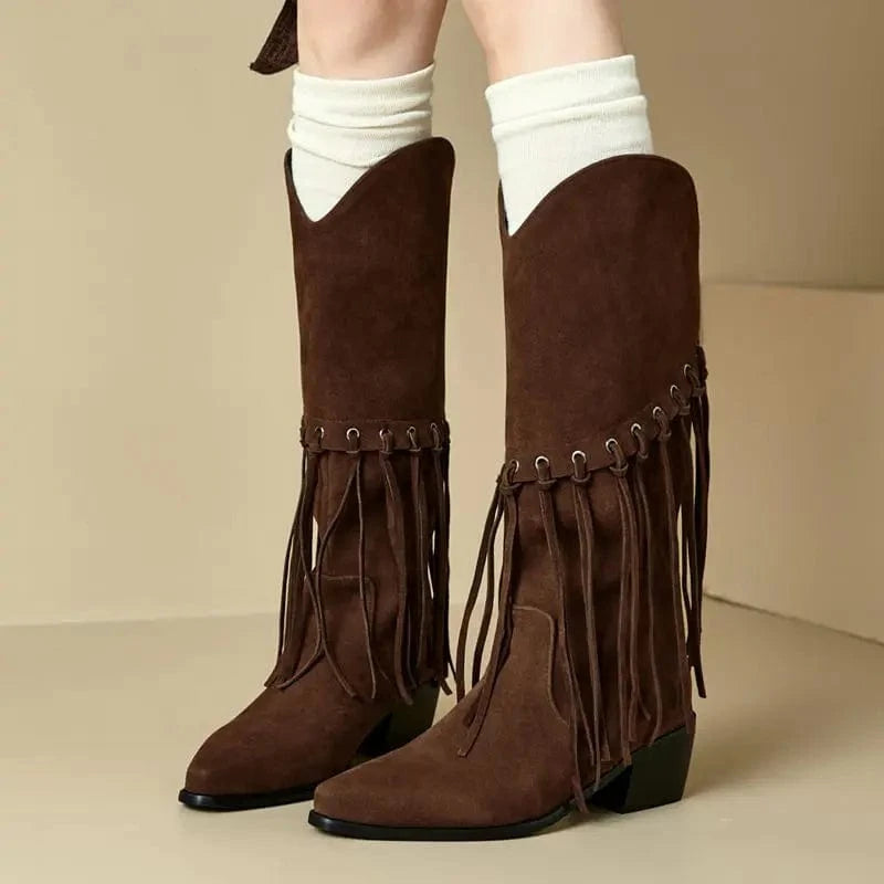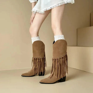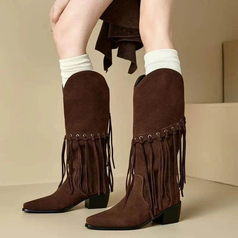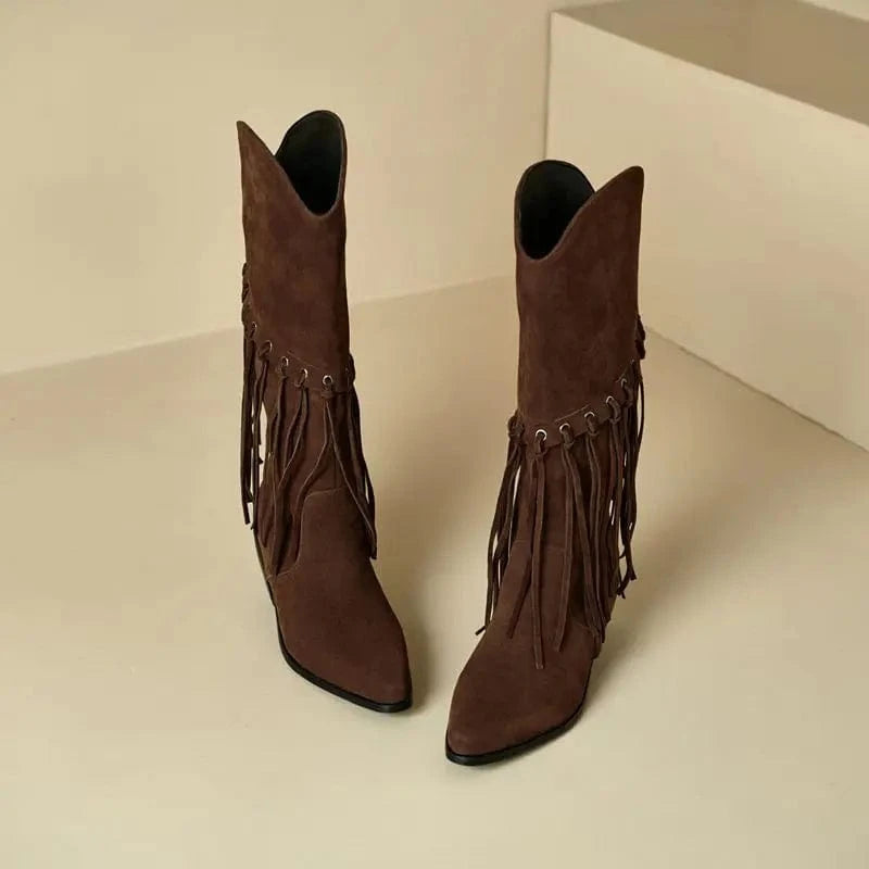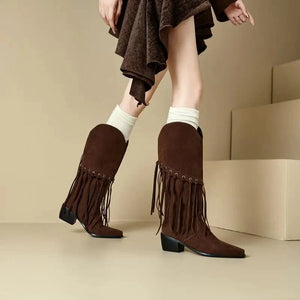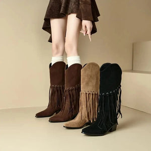Drömmer du om att fånga den där autentiska westernkänslan – med en modern och elegant twist? Våra höga cowboyboots med fransar i mjuk mockalook är skapade för dig som älskar frihet, rörelse och stil. Oavsett om du kliver ut på festivalfältet eller dansar under stjärnorna, blir de här stövlarna din trogna följeslagare.