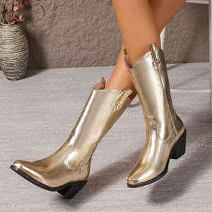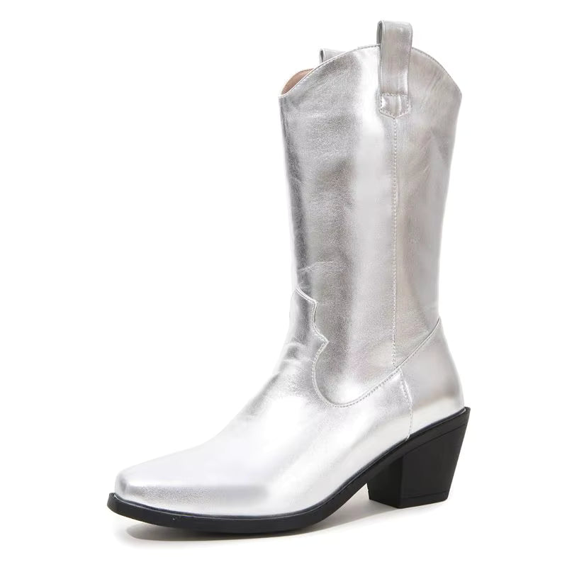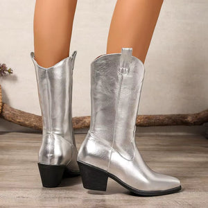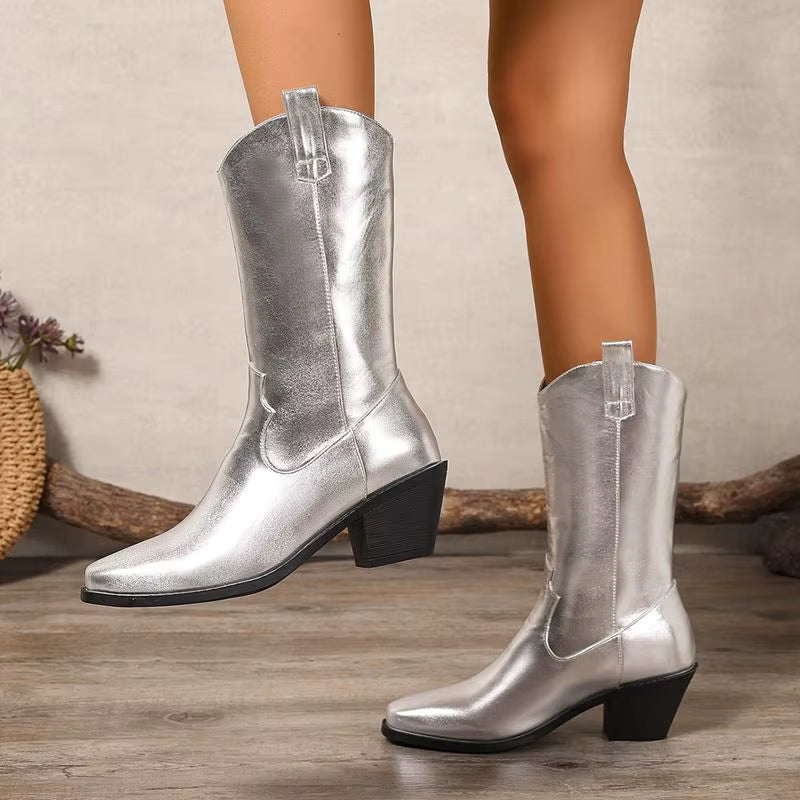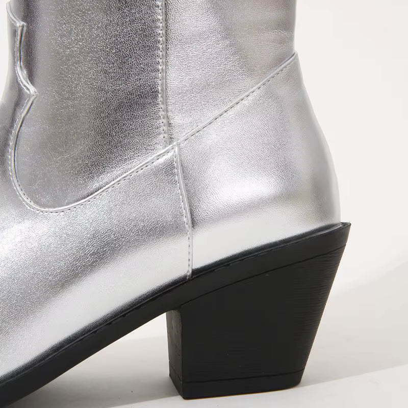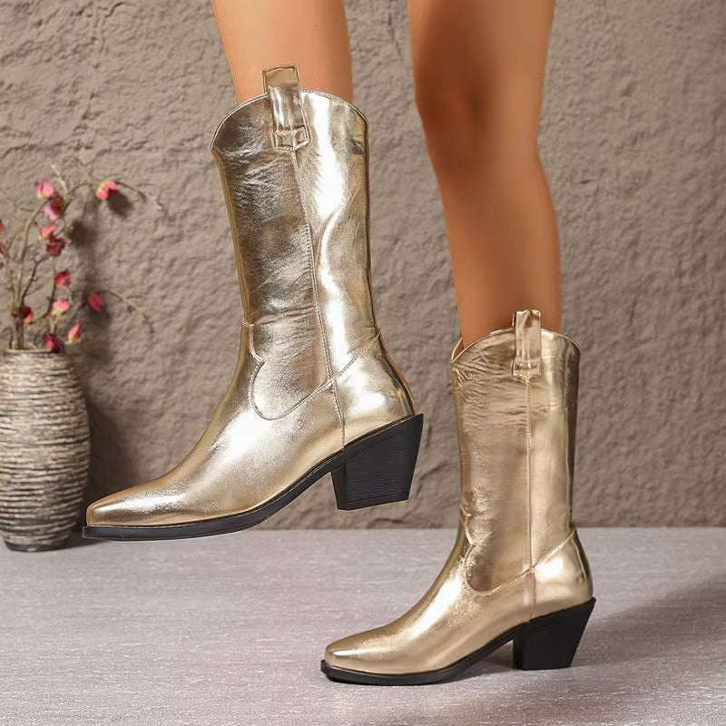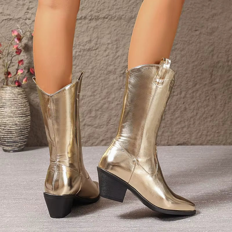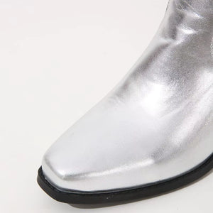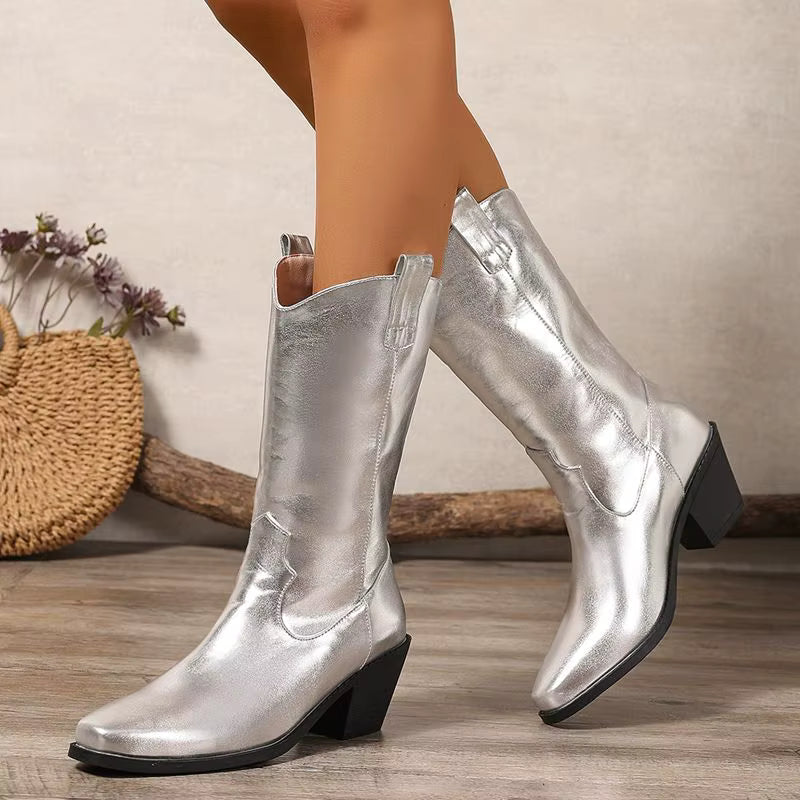 En modern tolkning av klassiska cowboy boots i metallicfinish – redo för både vardag och fest.