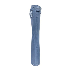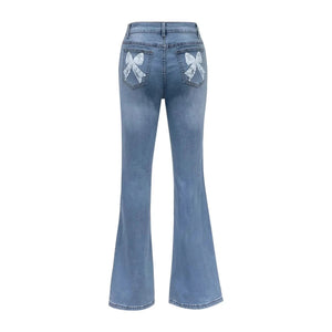 Högmidjade blå flare jeans med rosett-broderi för dam – romantik möter retro