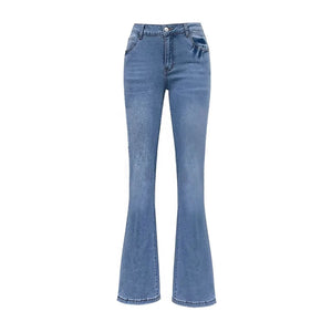 Ge din denimgarderob en touch av charm och personlighet med våra högmidjade blå flare jeans. Med sitt subtila rosettbroderi baktill och den smickrande passformen blir de snabbt dina nya favoriter.