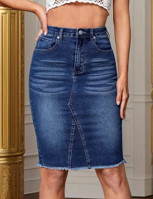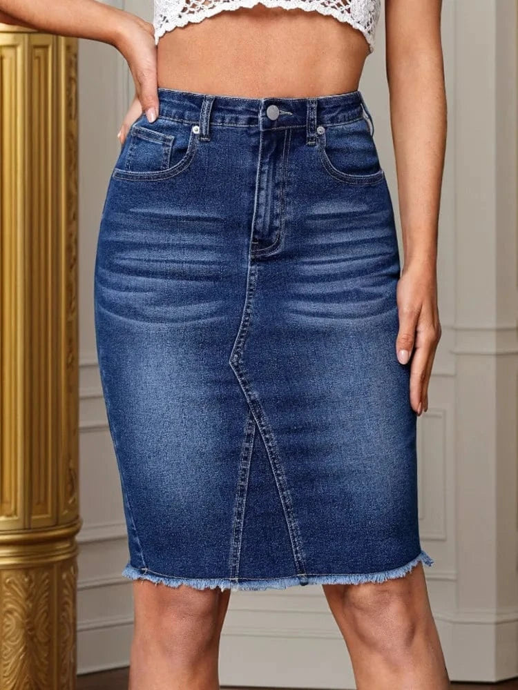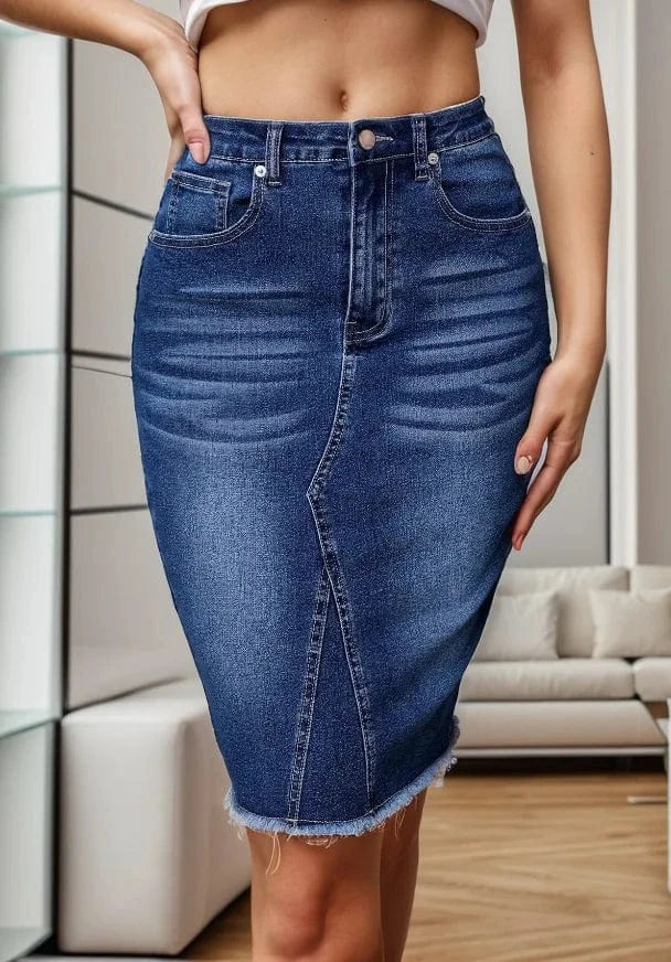 Letar du efter en kjol som får dig att känna dig både kraftfull och bekväm? Denna jeanspennkjol med slits är din nya stilfavorit. En smal silhuett, fransad fåll och en subtil slits gör den till ett statementplagg med mycket attityd.