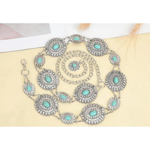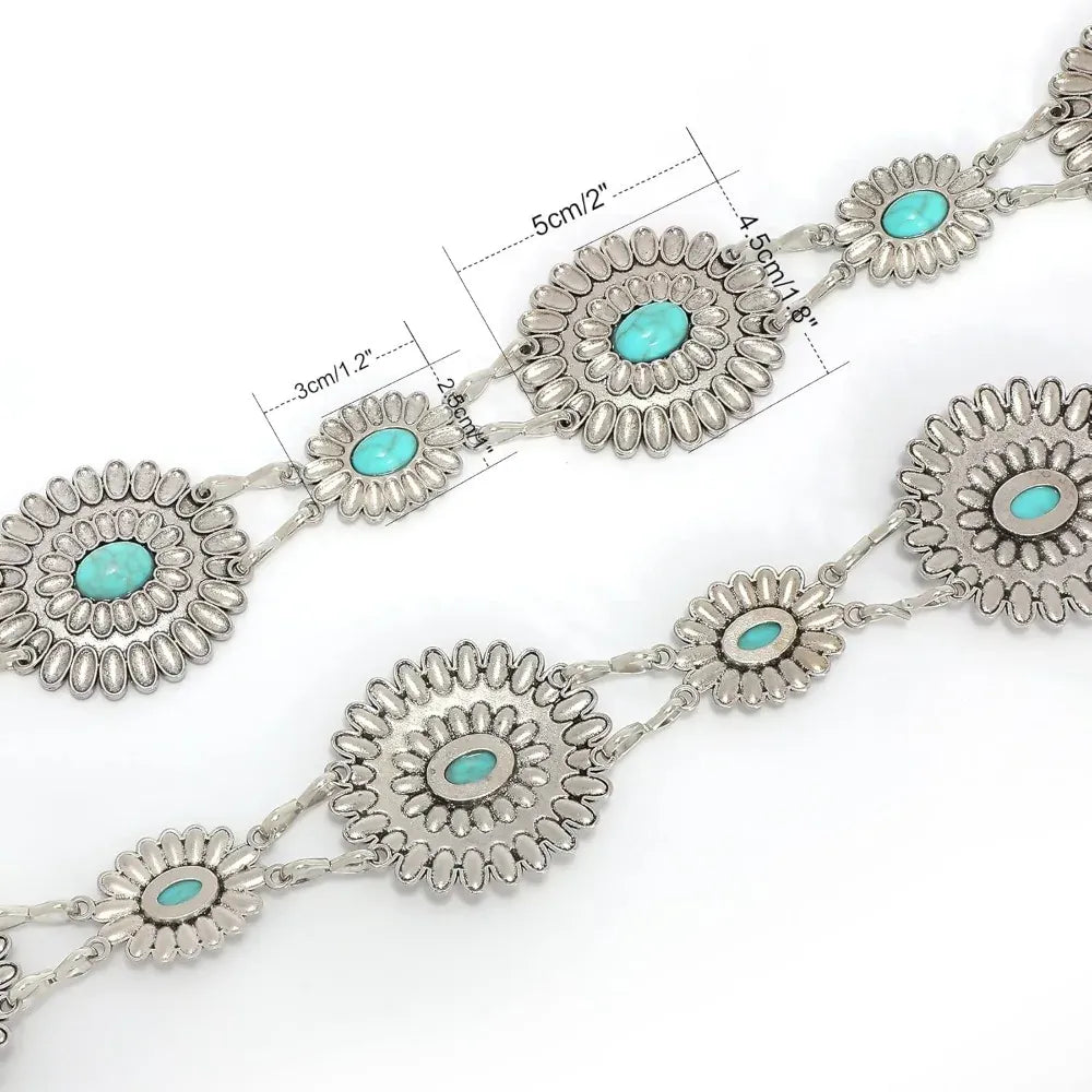 Gör varje outfit till ett statement med vårt kedjebälte i cowgirlstil – ett bälte som lika gärna kunde ha suttit på en rodeodrottning som på en modern festivalikon. De turkosa stenarna och detaljerade conchos i metall ger en boho-västern vibe som lyfter både jeansshorts och maxiklänningar. Det här är inte bara ett bälte – det är en accessoar som berättar en historia.