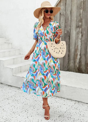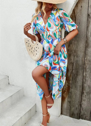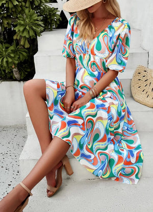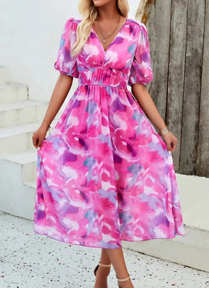Upplev friheten och glädjen av sommaren i denna vackra blommiga klänning. En tidlös klassiker som förvandlar varje dag till ett speciellt tillfälle – från strandpromenader till kvällsfester.