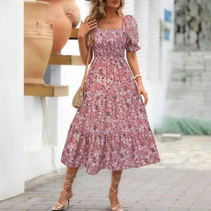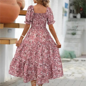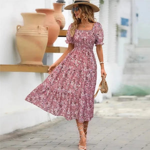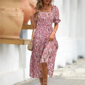 Låt denna vackra klänning med rosa blommor bli din följeslagare i sommar. Perfekt för lata dagar i solen, picknickar eller en tur på stan – alltid med en känsla av frihet och elegans.