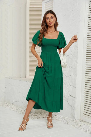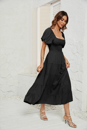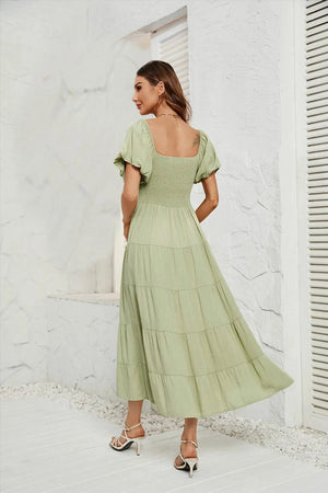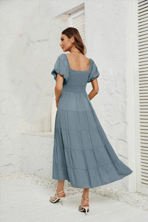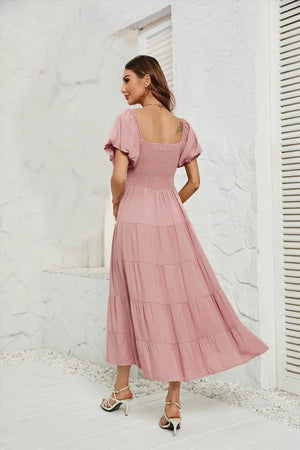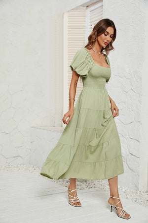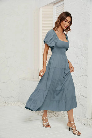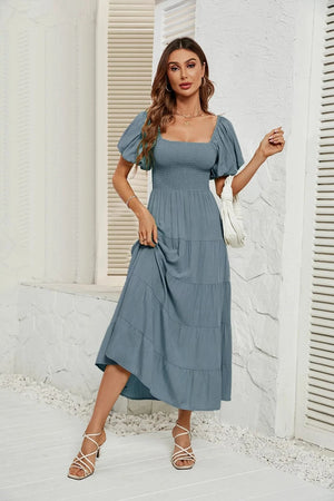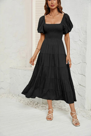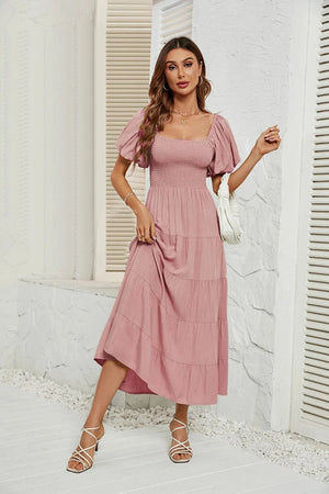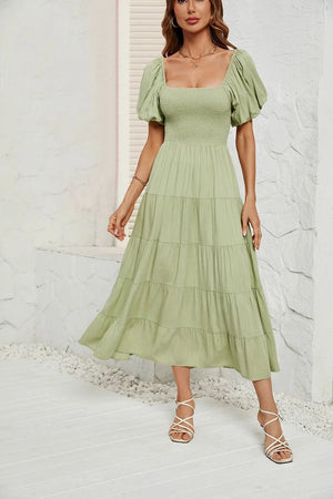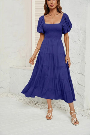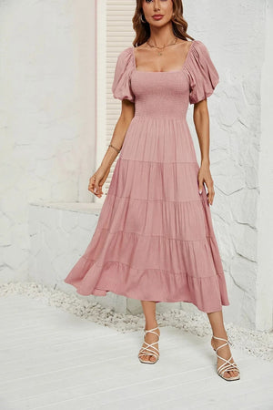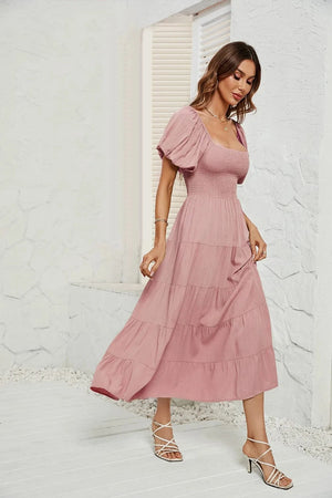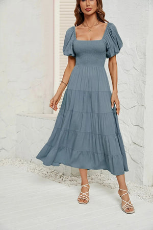 Upplev den perfekta balansen mellan komfort och elegans med denna luftiga klänning med smock i midjan. Ett måste i din garderob för vårens och sommarens alla tillfällen – från picknick i solen till dans under stjärnorna.