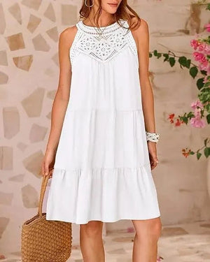Ge din stil en romantisk och bohemisk touch med denna luftiga klänning med virkad spets. Perfekt för varma sommardagar, strandpromenader eller en kväll ute på stan – alltid med en känsla av lätthet och elegans.