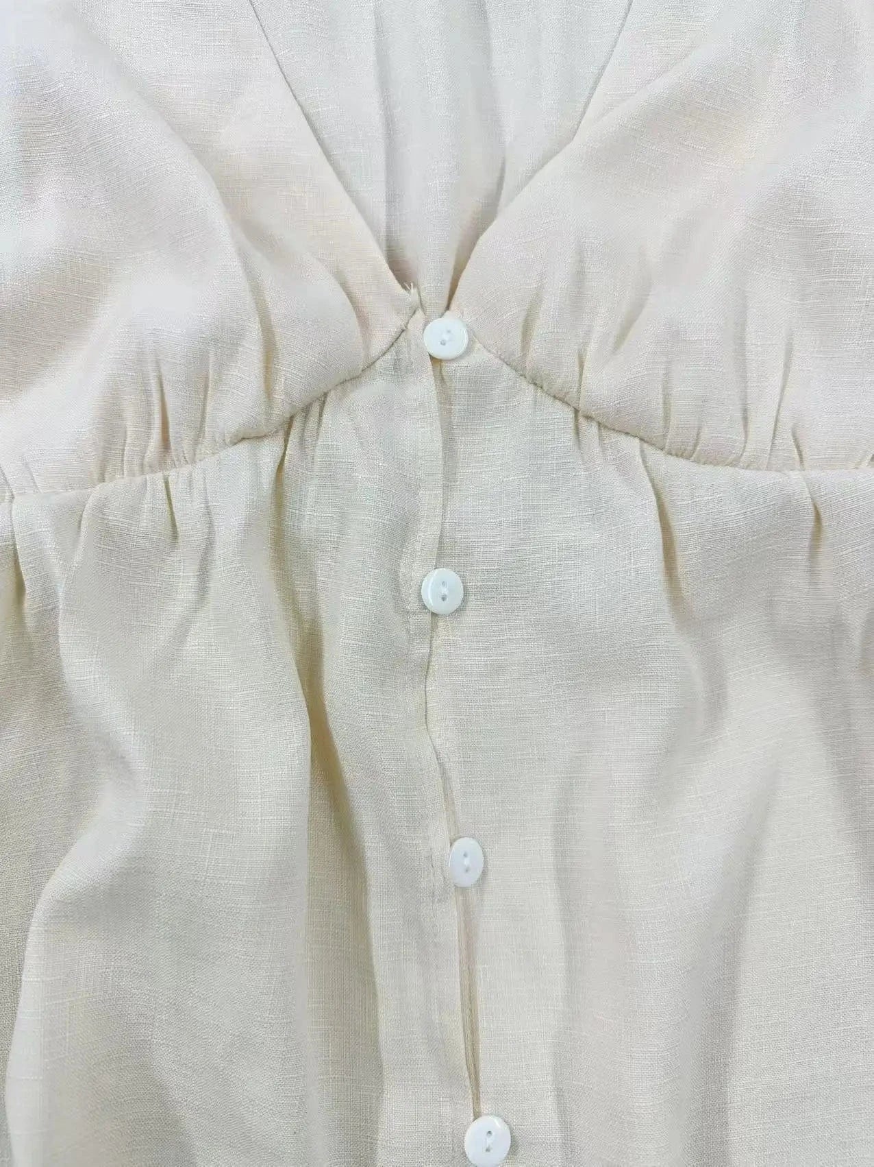- Djup V-ringning – Skapar en elegant och luftig siluett.