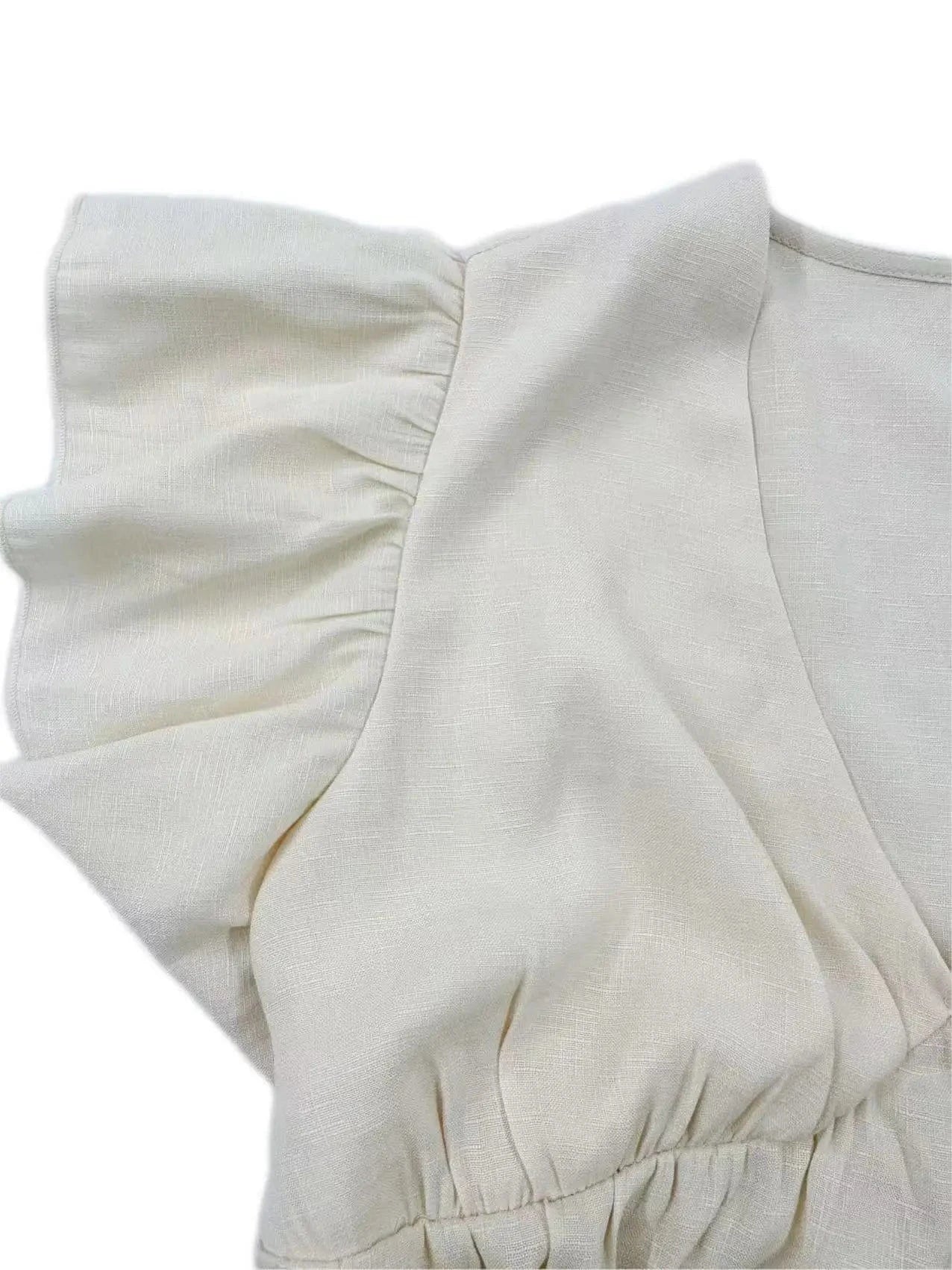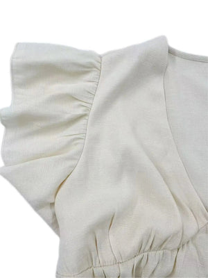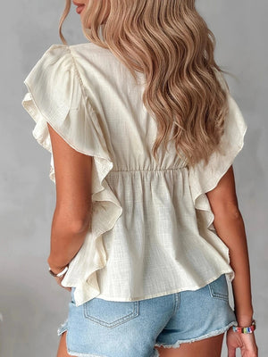 Känn sommarbrisen mot huden och låt din feminina sida lysa fram med denna kortärmade beige blus. Med sina mjuka volanger, djupa V-ringning och lätta tyg är den det perfekta valet för en avslappnad men ändå chic look.