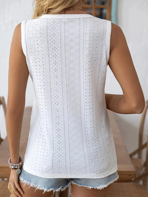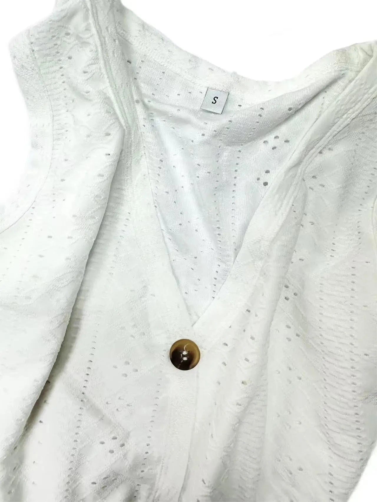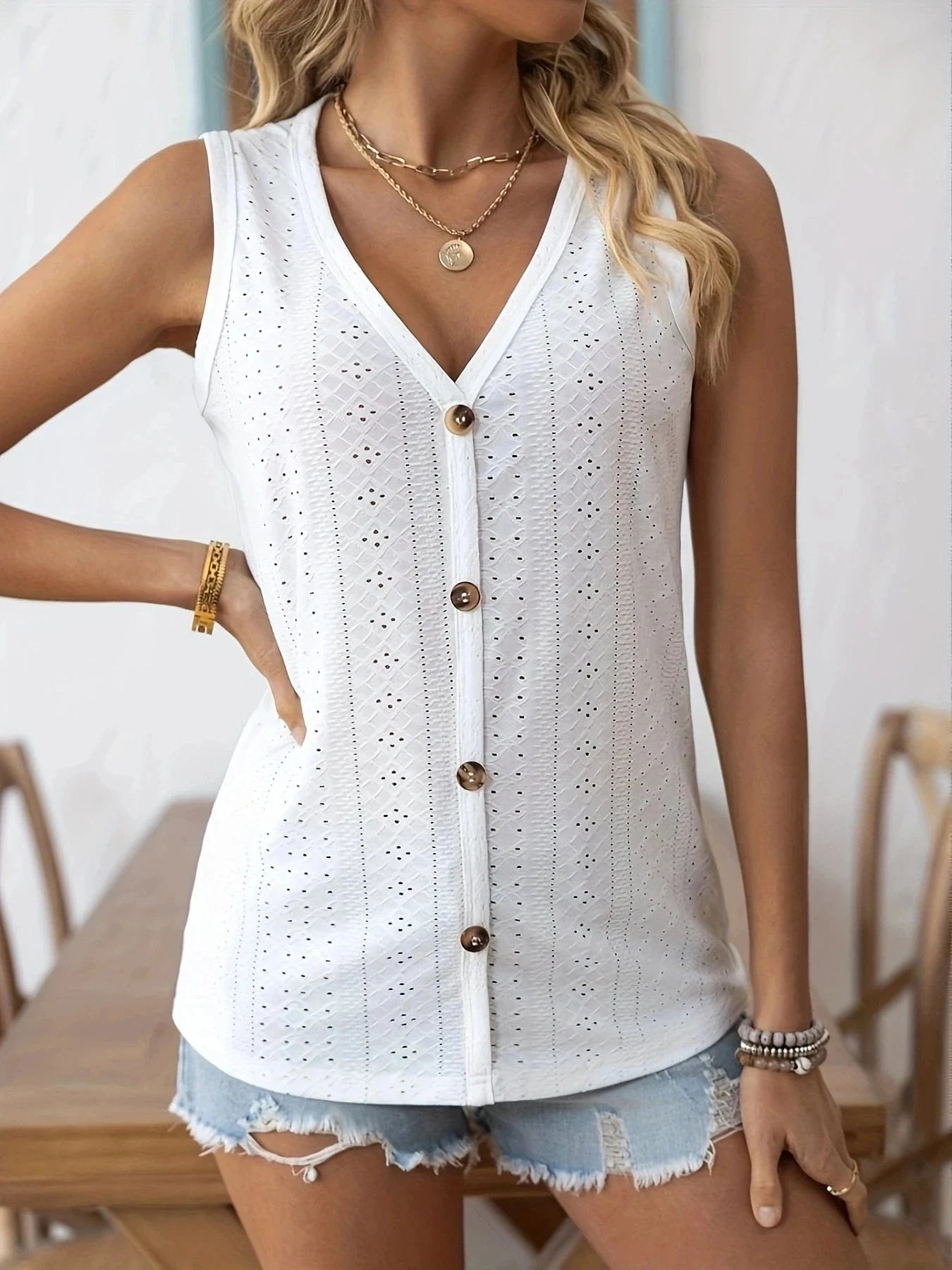 Skapa en tidlöst chic stil med denna kortärmade vita blus. Med sina dekorativa hålbroderier, knäppning framtill och mjuka stretchiga material är den det perfekta valet för en luftig och elegant sommaroutfit.