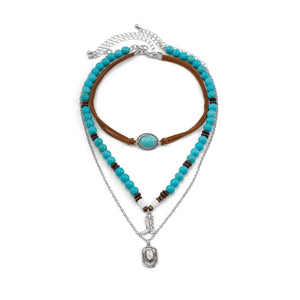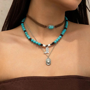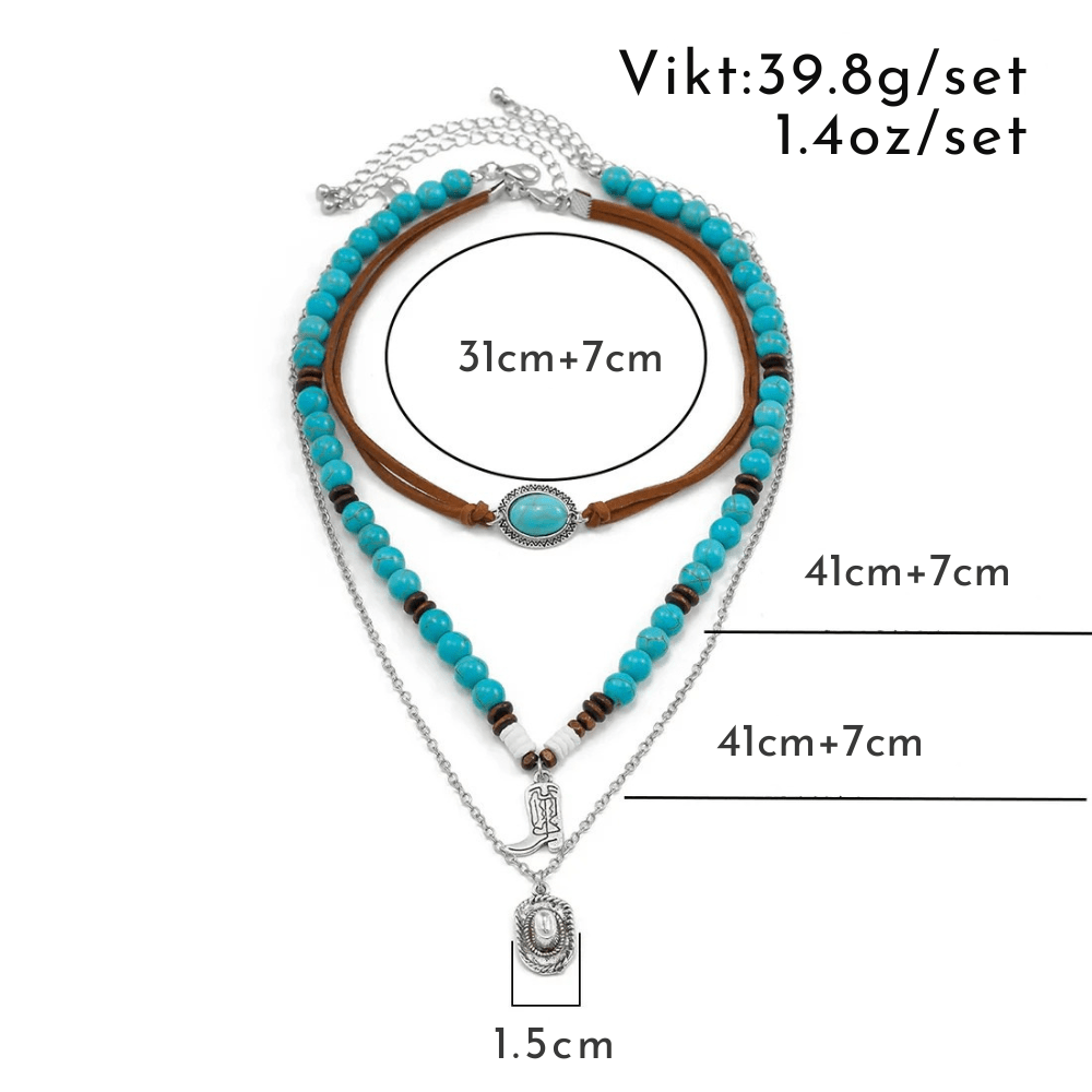 Låt din stil blomstra med detta lager-på-lager halsband i bohemisk westernstil. De turkosa pärlorna möter detaljer i metall och läder för en känsla som andas frihet, styrka och äkta karaktär.