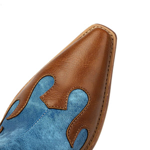 Letar du efter boots som verkligen sticker ut? Dessa handgjorda låga cowboystövlar kombinerar retrodesign, denimstruktur och brunt läder i en oemotståndlig mix. Den markerade klacken, de eleganta sömmarna och det vågformade mönstret gör dem till ett statement för dig som vågar. En perfekt balans mellan edgy western-look och feminin elegans.