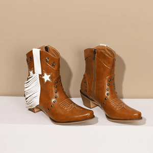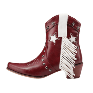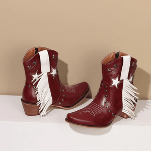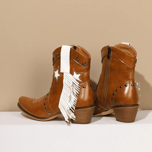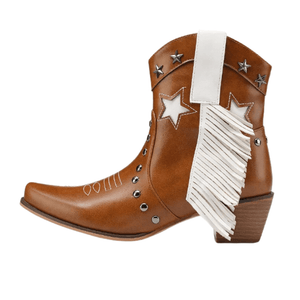 Ge din cowboylook en modern twist med dessa fantastiska boots! De låga cowboystövlarna med dekorativa fransar och stjärnor är skapade för dig som vill känna dig både självsäker och bekväm – oavsett om du är på dansgolvet, ute på stan eller på en festlig kväll med vänner. Med sin höga komfort och rockiga detaljer blir de snabbt ett par du inte vill vara utan.