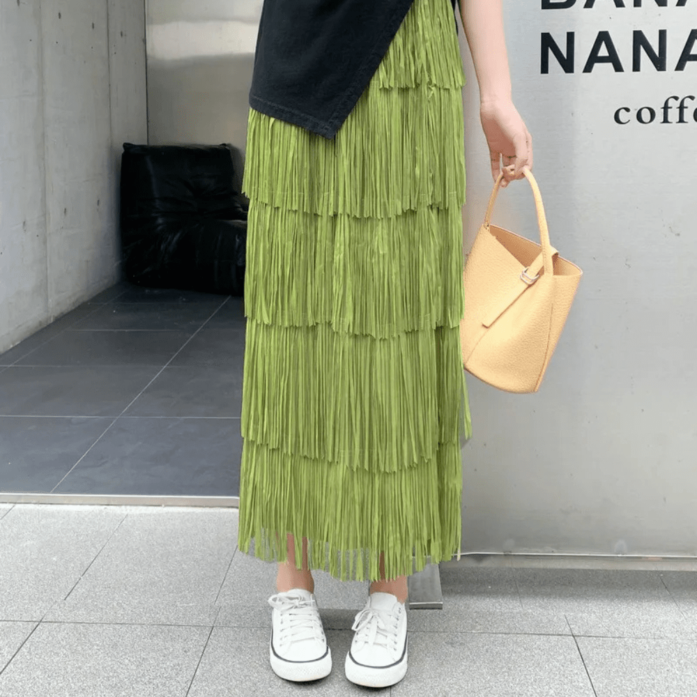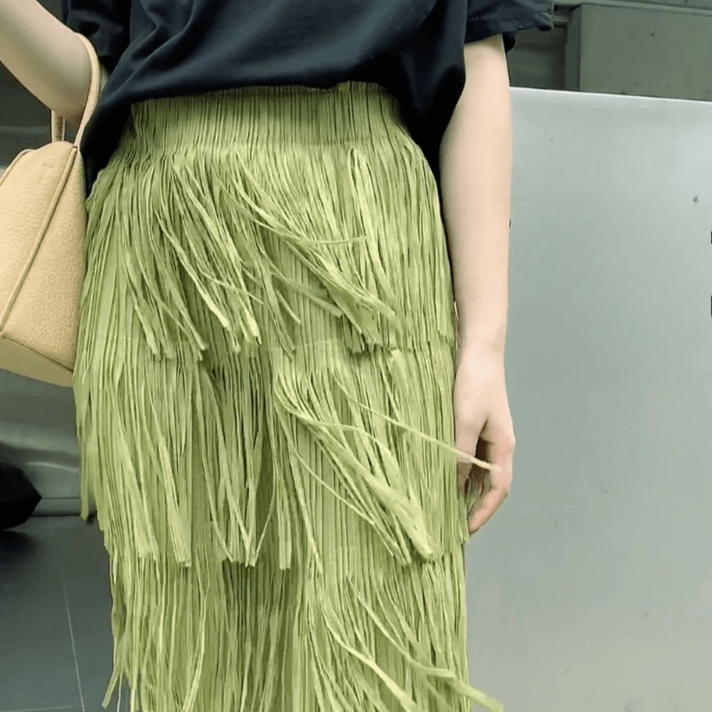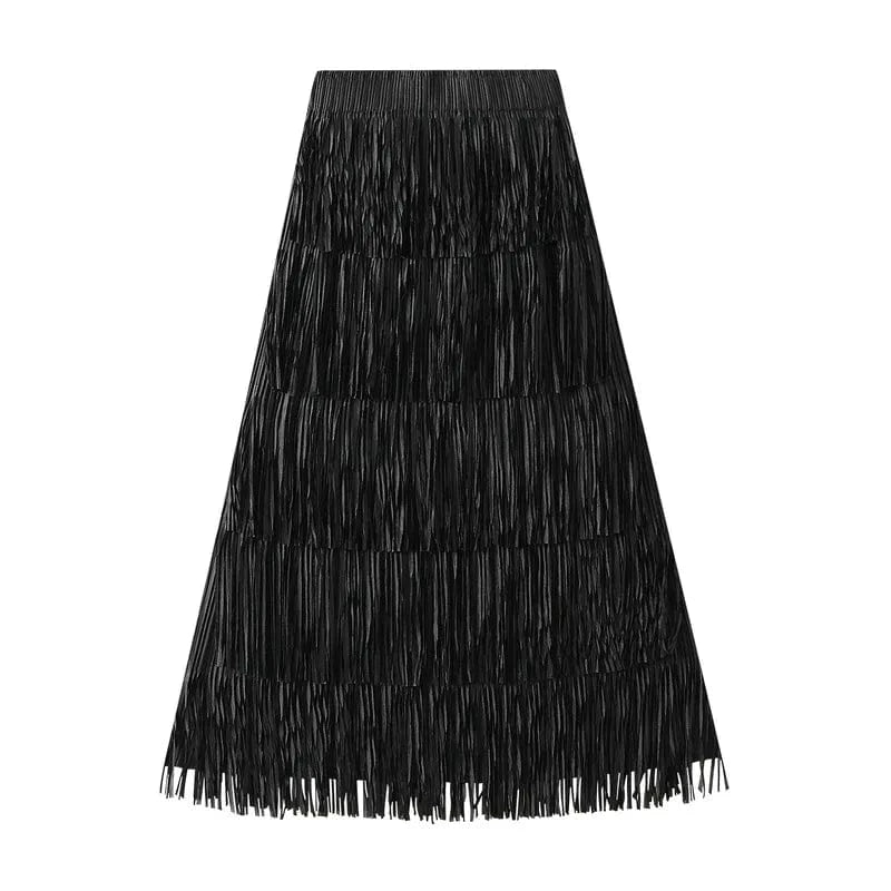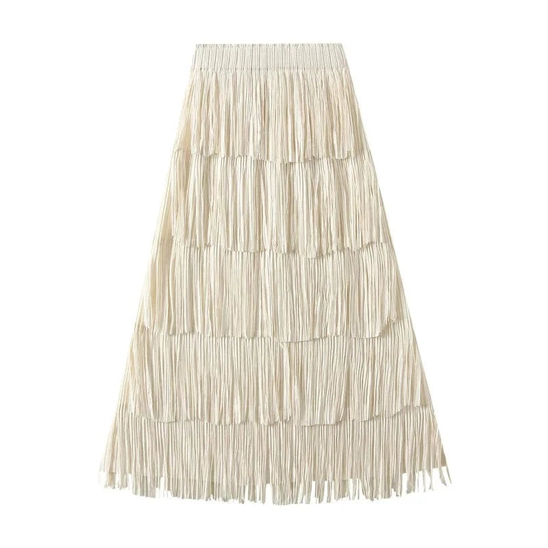 Ge din stil en lekfull och samtidigt elegant twist med vår långa festkjol med fransvolanger. Varje steg blir en dans när fransarna följer dina rörelser och ger liv åt din outfit – perfekt för både sommarkvällar och festliga tillfällen.
