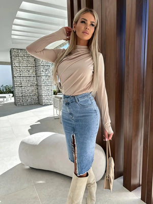 Elegant, avslappnad och vågad på samma gång – vår långa jeanskjol med hög slits är allt du behöver för en sofistikerad look med attityd. En hyllning till klassisk denim med en modern edge.