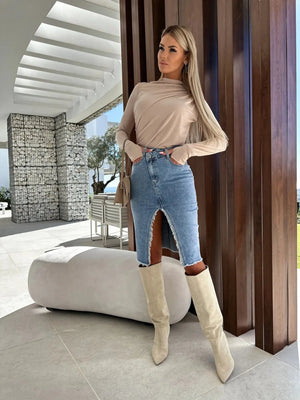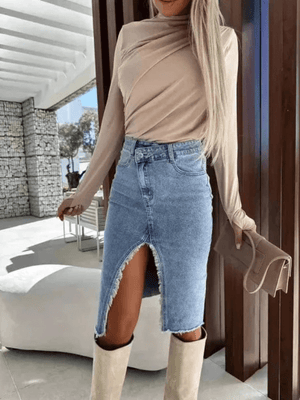 Lång jeanskjol med hög slits – tidlös denim med en oväntad twist
