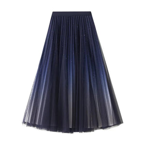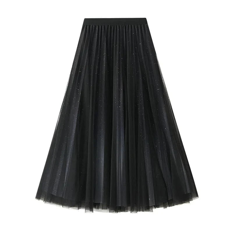 Fånga känslan av en klar natthimmel och låt varje steg glimma med magi. Denna långa, plisserade tyllkjol med subtila glitterdetaljer är skapad för att ge dig en elegant och drömlik närvaro, perfekt både för vardagens romantiska stunder och kvällens festliga tillfällen.