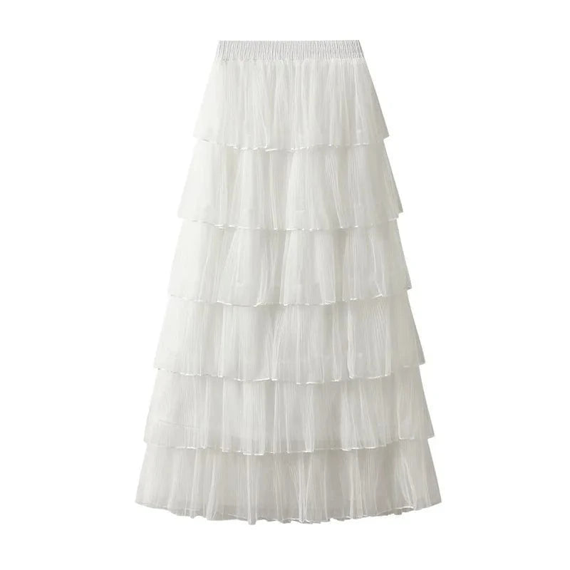 Upplev den perfekta kombinationen av volym och lätthet med vår långa tyllkjol med plisserade volanger. Varje lager är noggrant designat för att skapa en harmonisk rörelse som följer dig från dag till kväll.