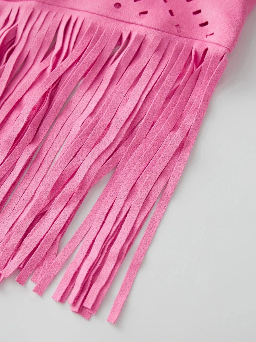 Låt din stil tala för sig själv med denna långa väst med fransar – en perfekt kombination av boho-vibbar och tidlös chic. Med sitt mjuka material, skira laserskurna detaljer och lekfulla fransar blir den ett nyckelplagg i din vår- och sommargarderob.