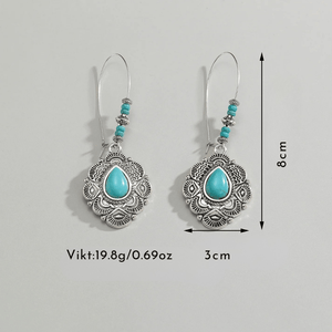 Ge din outfit en känsla av frihet och äventyr med dessa långa bohemiska silverörhängen med turkos. Med sina detaljerade mönster och starka färgkontraster blir de en självklar accessoar för varje cowgirl som vill sticka ut.