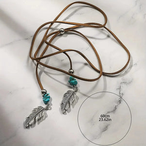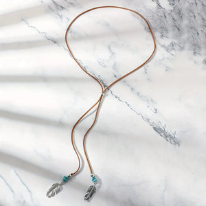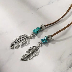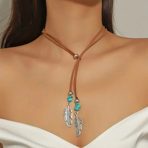 Lariat-halsband i mocka med fjädrar och turkos – ett smycke som fångar din fria ande