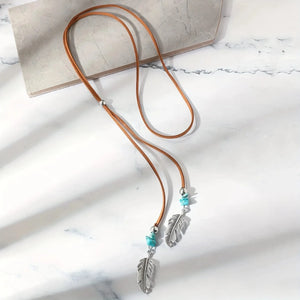 Lyft din stil med ett halsband som för tankarna till vida präriefält, solvarma vindar och cowgirl-energi. Detta lariat-halsband i mocka med turkosa detaljer och fjäderhängen är en hyllning till frihet och naturlig skönhet.